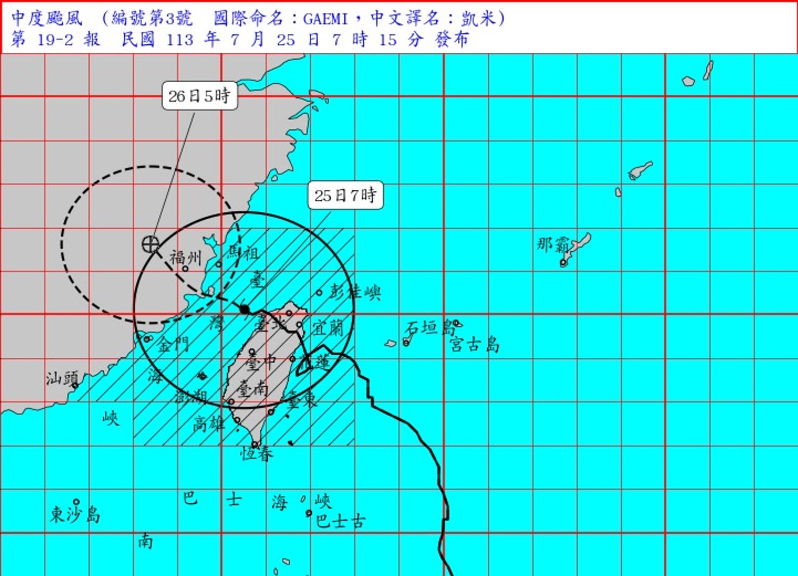 中央氣象署指出,凱米颱風中心預計傍晚會登陸福建,台灣本島陸上台灣警報最快在晚上解除。