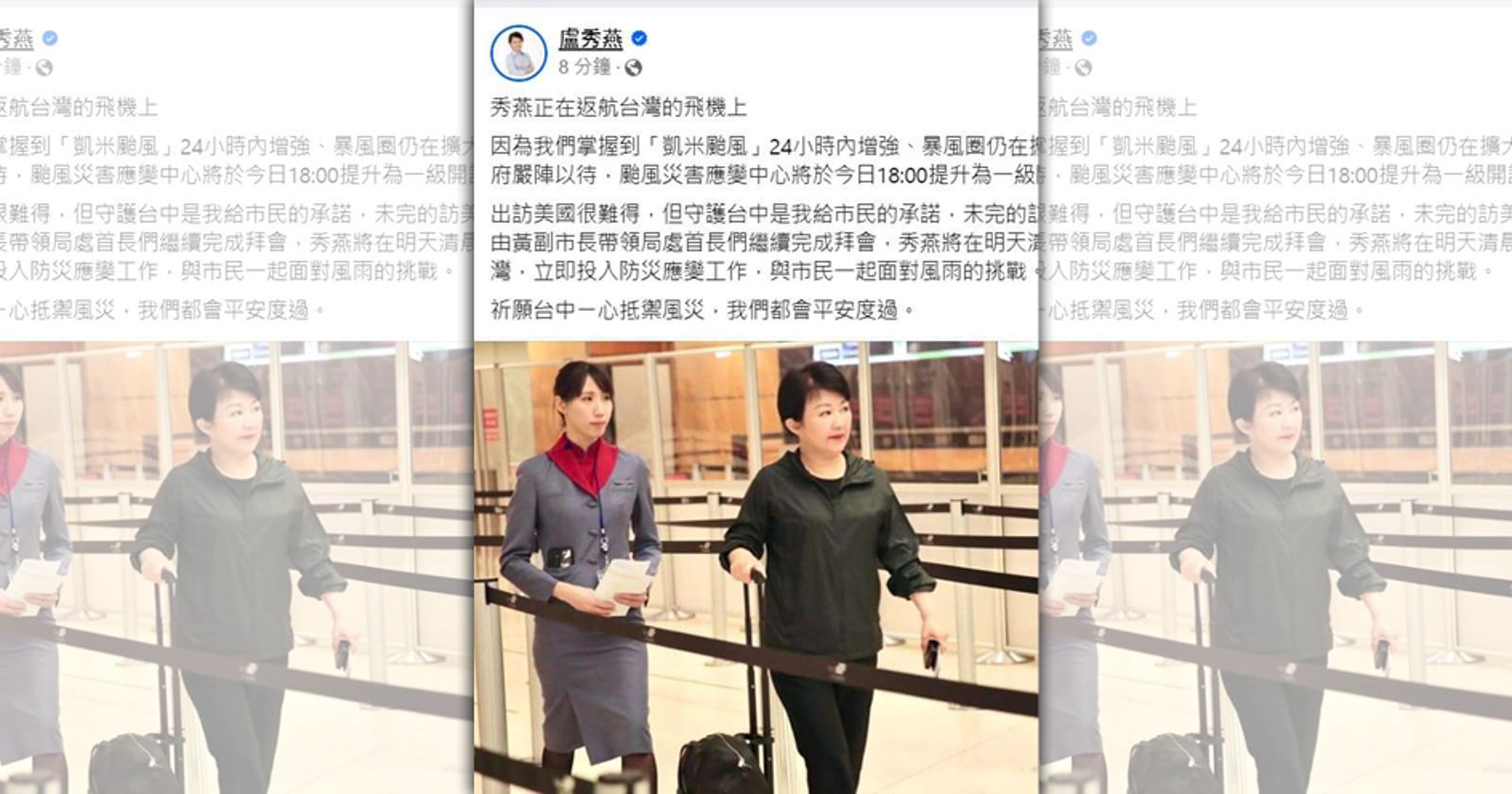 對此,臉書政論粉專《狼與羊的午餐投票》指出,盧秀燕的劇本和演技皆屬中上,不過,這樣的劇情鋪陳顯然還不夠細緻。於是,台北市議員游淑慧還加碼演出,透露她傳訊息給盧說:「辛苦了」,而盧秒回她已經在飛機上。游繼續追捧:「原來盧市長航程中,仍能與市府聯繫,開通了飛機網路,哈哈,台中市政的空軍一號嗎?」,還大讚盧是「鐵娘子」。「空軍一號」一詞,隱喻也符合盧爭大位的想望,「馬屁」拍得好,前程沒煩惱!