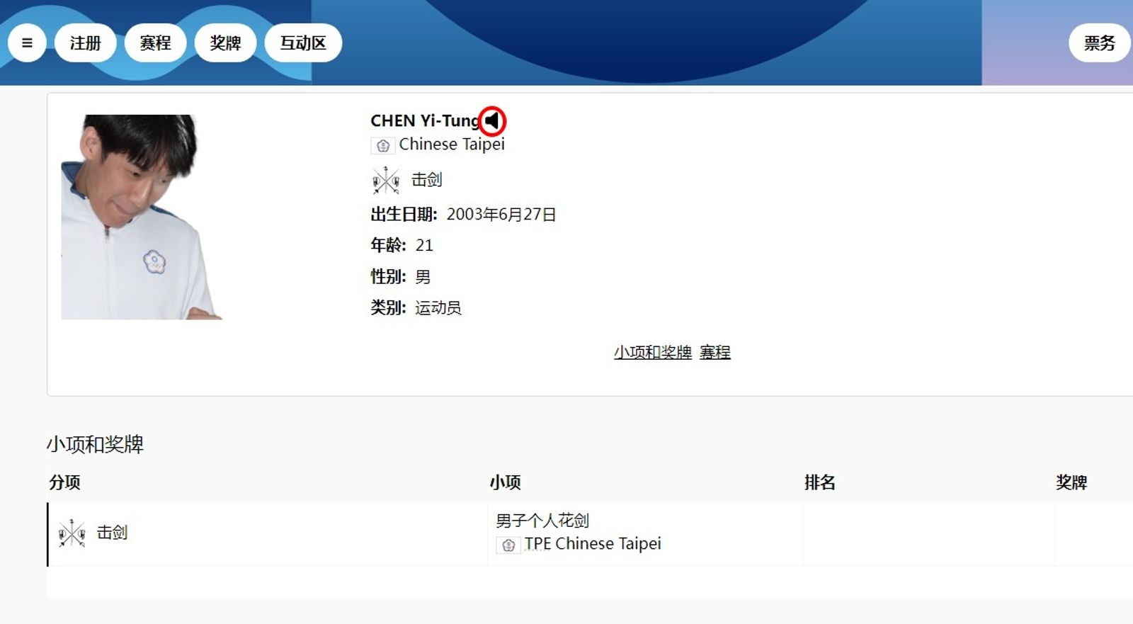 同樣調皮的還有擊劍選手陳亦通,該名字讀音功能點下去後,兩次唸出的聲音都根本不是「陳亦通」3個字,而是聽起來像唸了一串外文;另外,頭貼照也特別與眾不同,居然選用表情滑稽的側拍照片。