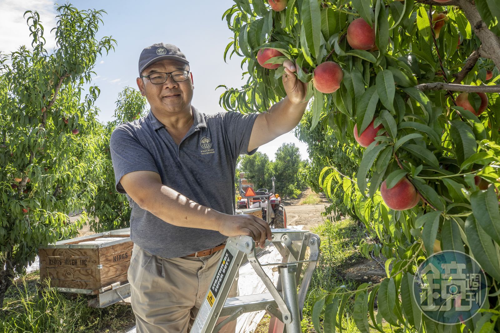 飛機飛越1萬多公里、13個小時抵達美國舊金山機場,距離中加州的誼馨園水果農場,仍有4小時車程,誼馨園董事長汪松林親自駕車接送,笑容如加州陽光溫暖。車子開往內陸,水氣變少,沿路山頭漸漸枯槁金黃,汪松林如導遊般介紹:「這邊是地中海型氣候,冬天夠冷卻不會下雪,夏天日照時間長,很適合水蜜桃生長。」閃亮的加州百年來承載著無數淘金夢,汪松林赴美打拚28年,才在浪潮中站穩。
