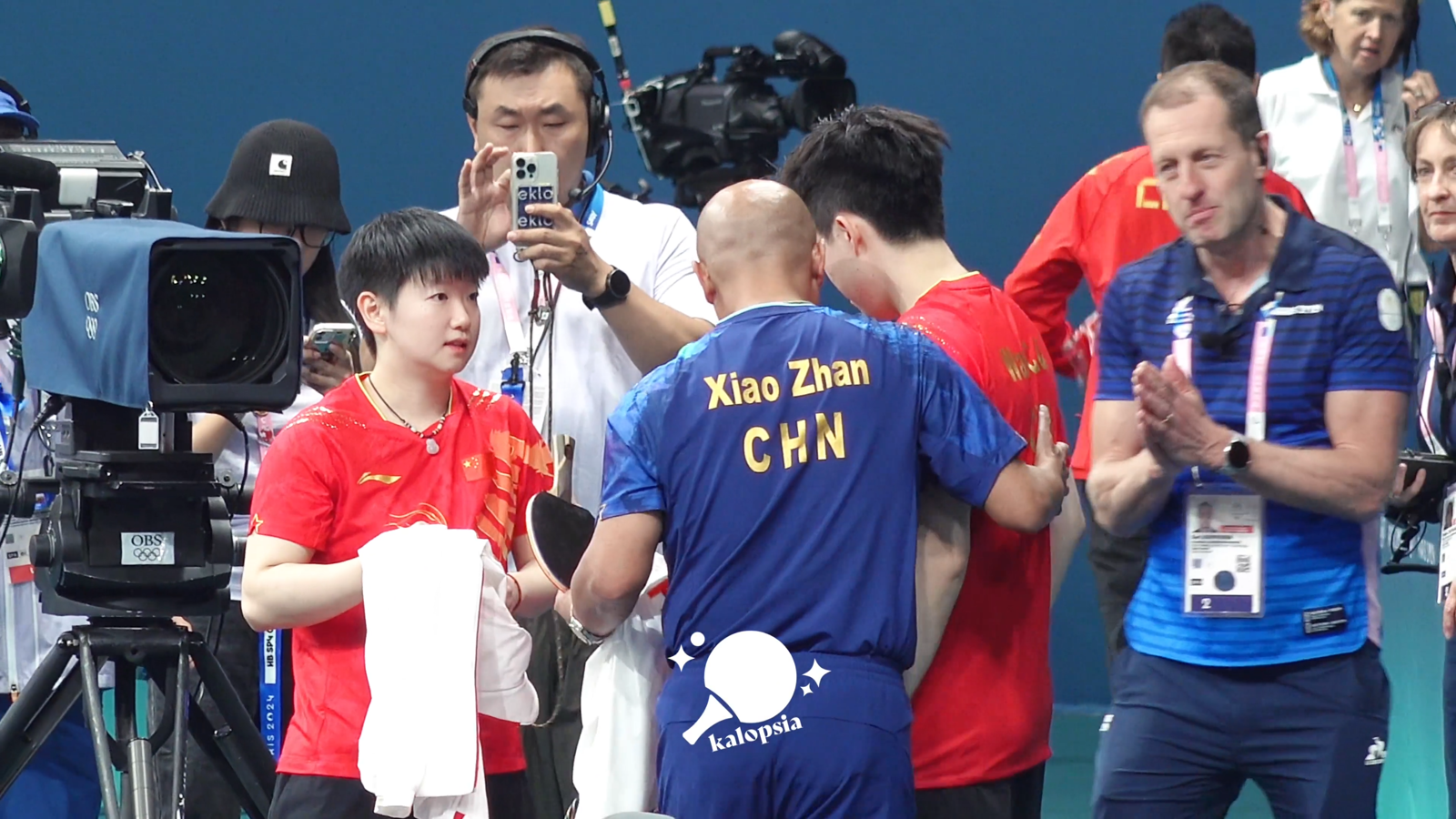 王楚欽(右2)奪下混雙金牌後,從教練口中得知球拍遭攝影師踩斷,情緒不佳。(翻攝微博@Kalopsia__)發布時間:2024.07.31 12:46 臺北時間