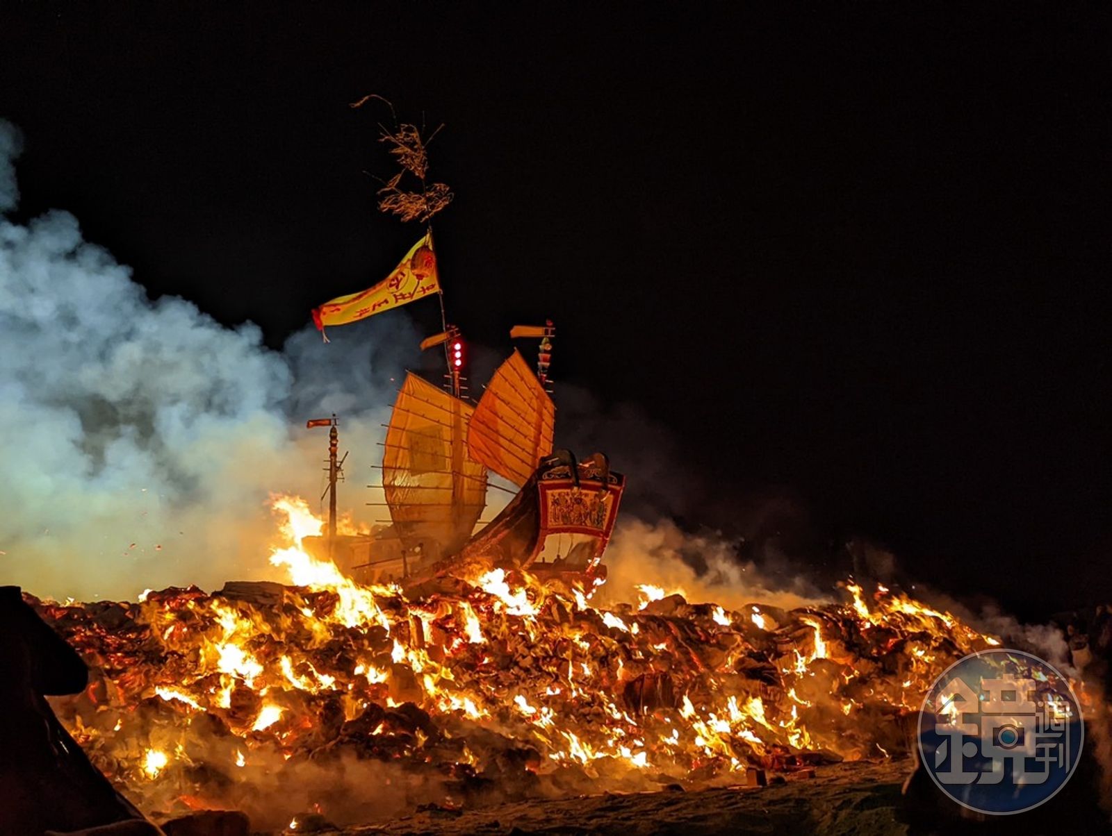 王船遶境直至天黑才回到三隆宮,但是全島沒有閒下來,緊接著凌晨就是最後的重頭戲「火燒王船」,也就是恭送大千歲的時刻。深夜恭奉大千歲上轎後,跟著王船再度來到中澳沙灘,在居民同心協力下,將添載來的金紙、庫錢堆疊在王船上,也要讓王爺大千歲「滿載而歸」。
