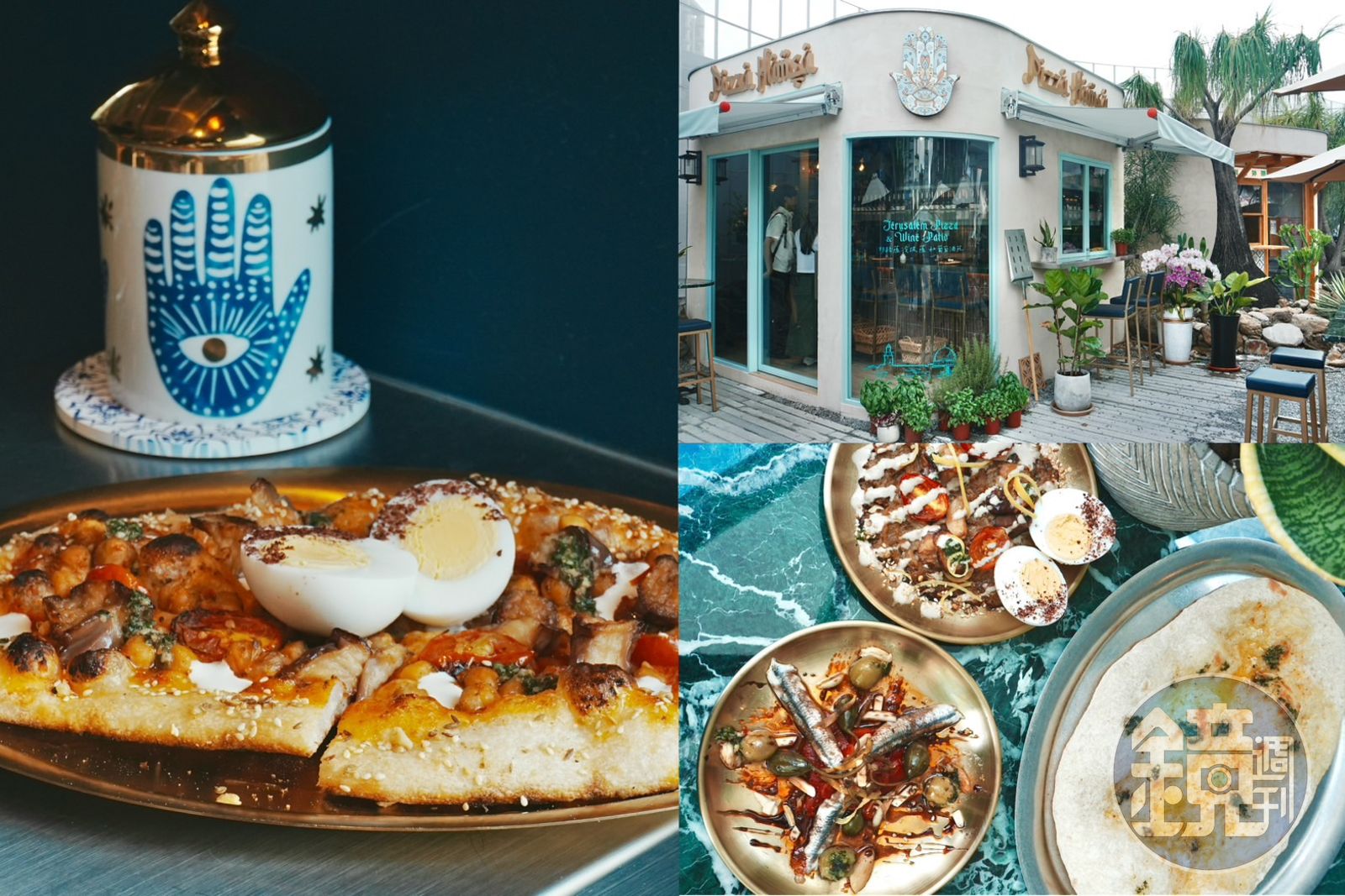 耶路撒冷的主食為麵包,Tomer特別選用頂級的義大利麵粉,並特意拉高麵團的含水量,即便成型、發酵及烘烤的過程上困難度也增加,卻更能呈現外層酥脆,內在軟中帶嚼勁的口感,不僅風味上類似酸種麵包,相對也更容易消化。「中東茄子鷹嘴豆」是我最喜歡的口味,烤茄子和鷹嘴豆搭配哈里薩醬,另外再捏碎水煮蛋夾入Pizza中一起入口,香氣和豐富度十足。