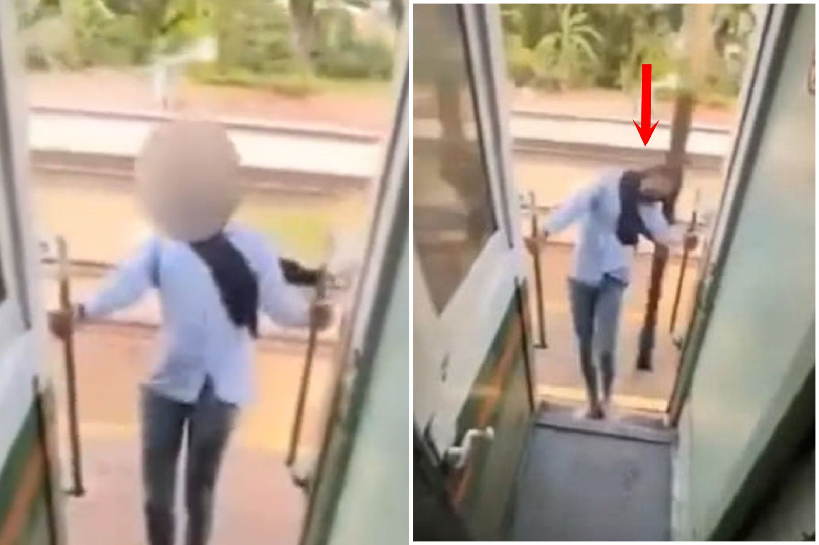 但女子白目的舉動,馬上讓她嘗到苦頭,在火車高速行駛下,讓她的頭部直接重重撞到柱子。女子一度重心不穩,快要跌出車廂外,幸好她的雙手緊抓著梯子扶手,才保持平衡。