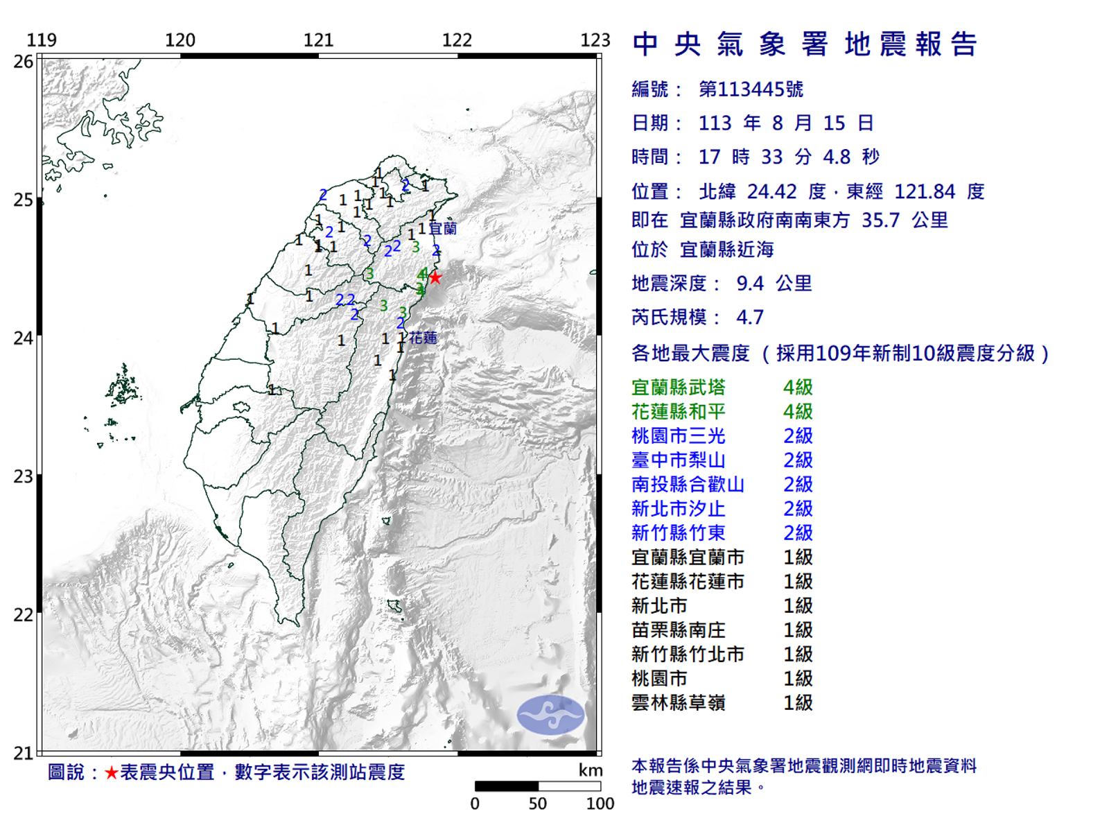 中央氣象署指出,17時33分宜蘭縣政府南南東方35.7公里,宜蘭縣近海發生規模4.7、深度9.4公里的地震,最大震度4級在宜蘭及花蓮,桃園、台中、南投、新北、新竹最大震度為2級,雲林及苗栗最大震度為1級。