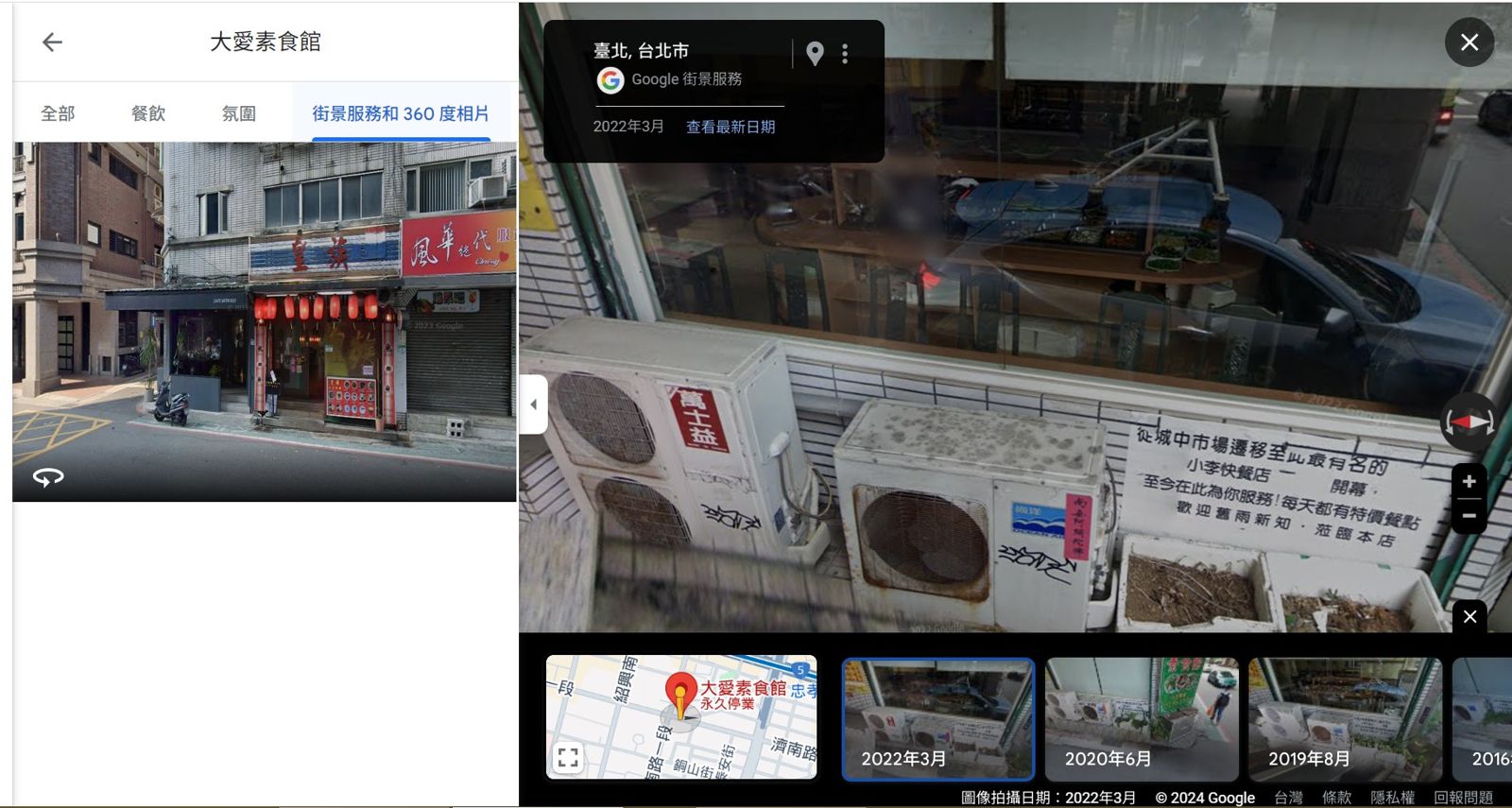 實際打開Google地圖,可以看到2022年3月,素食店轉角的牆壁上有一張白底黑字公告,上面寫著:「從城中市場遷移至此處最有名的小李快餐店開幕,至今在此為你服務」。台北城中市場內確實曾有一家小李快餐店,販售的小雞飯遠近馳名,小李快餐店在商業登記的名稱是「木子李快餐店」,地址及負責人均與大愛素食天地一模一樣。木子李快餐店目前在經濟部商工登記查詢顯示歇業中,在財政部稅籍登記資料則顯示非營業中,大愛素食天地則是營業中。