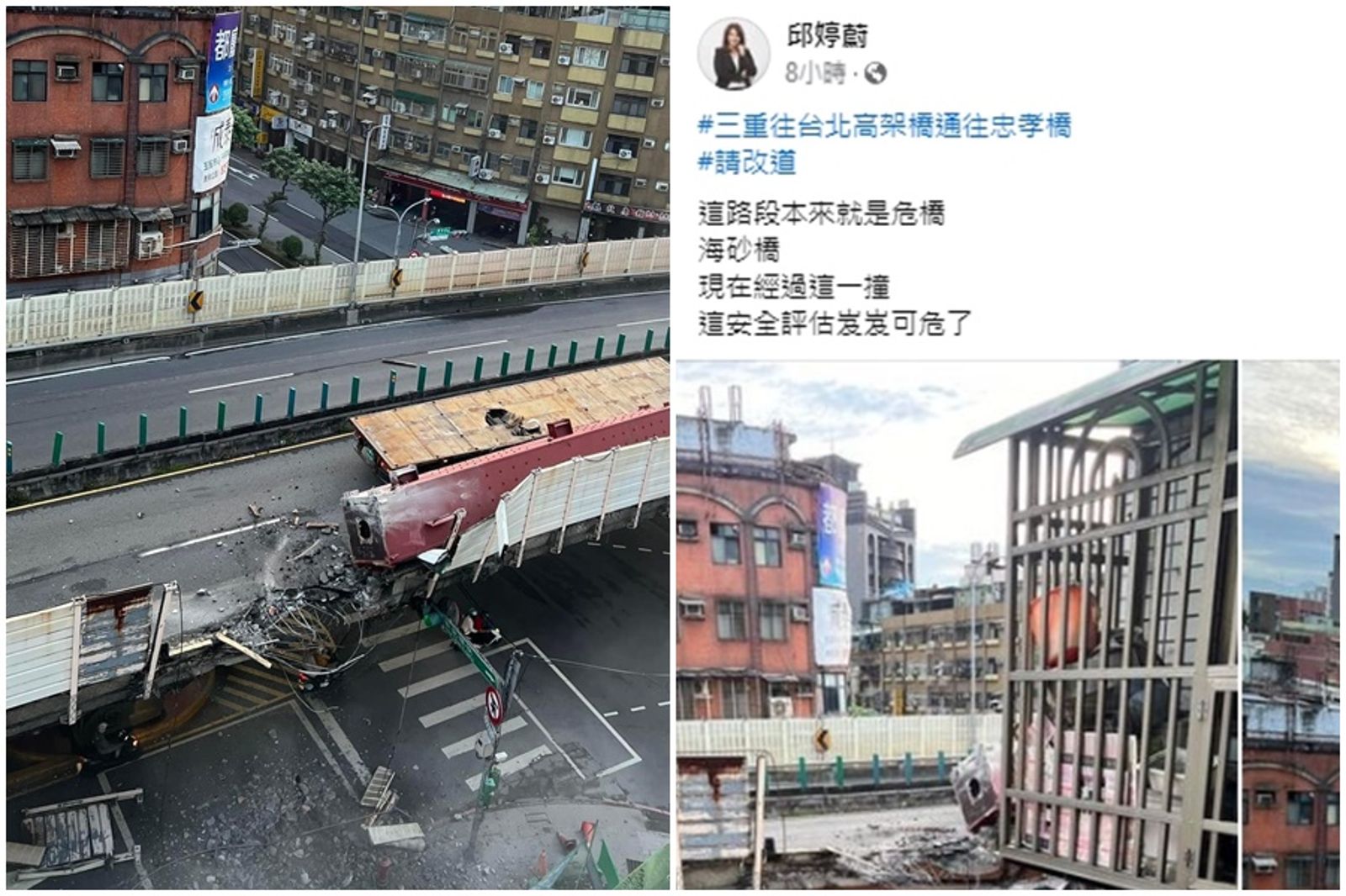 對此,民進黨籍新北市議員邱婷蔚在臉書上發文稱「這路段本來就是危橋、海砂橋」,直言現在經過這一撞「這安全評估岌岌可危了」,並表示撞破的地方經常有水泥掉落的情況。