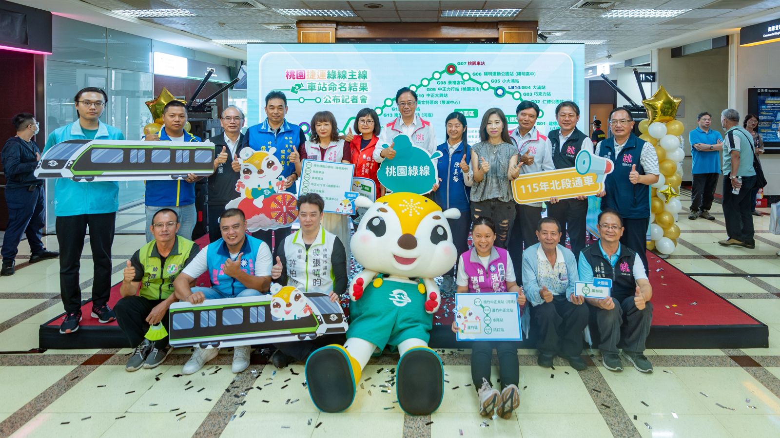 張善政表示,桃園捷運綠線全線共17座車站,其中北段7站即將於2026年通車,捷工局舉辦主線車站徵名和站名票選活動,平均每座車站徵到355個名稱,網路票選總投票數達20餘萬票,均顯示市民朋友對捷運綠線的高度期待。