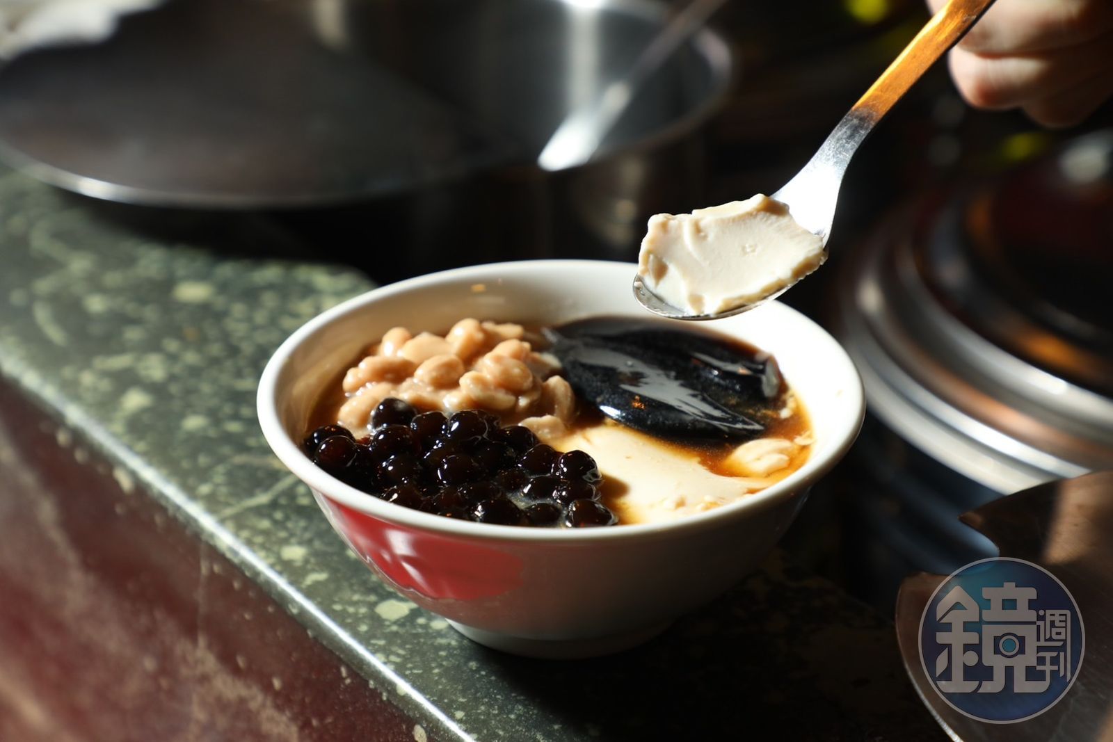 可選3種配料的「綜合冰」,是客人多次敲碗後誕生的品項。(65元/份)吧檯前的座位區是長板凳,復刻了早期坐在戶外攤位吃豆花的場景。雹仔豆花(士林店)