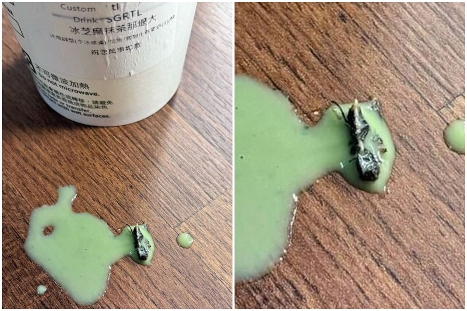 一名女網友在社群上發文指控,20日下午前往中清路星巴克消費,買了一杯大杯「冰芝麻抹茶那堤」,然而到了晚上約11點多,喝到最後一口時,竟驚覺喝到異物,吐出來才知道是一隻如女生小指頭般大小的蒼蠅,且被咬破的蒼蠅肚皮還跑出數隻死蛆。