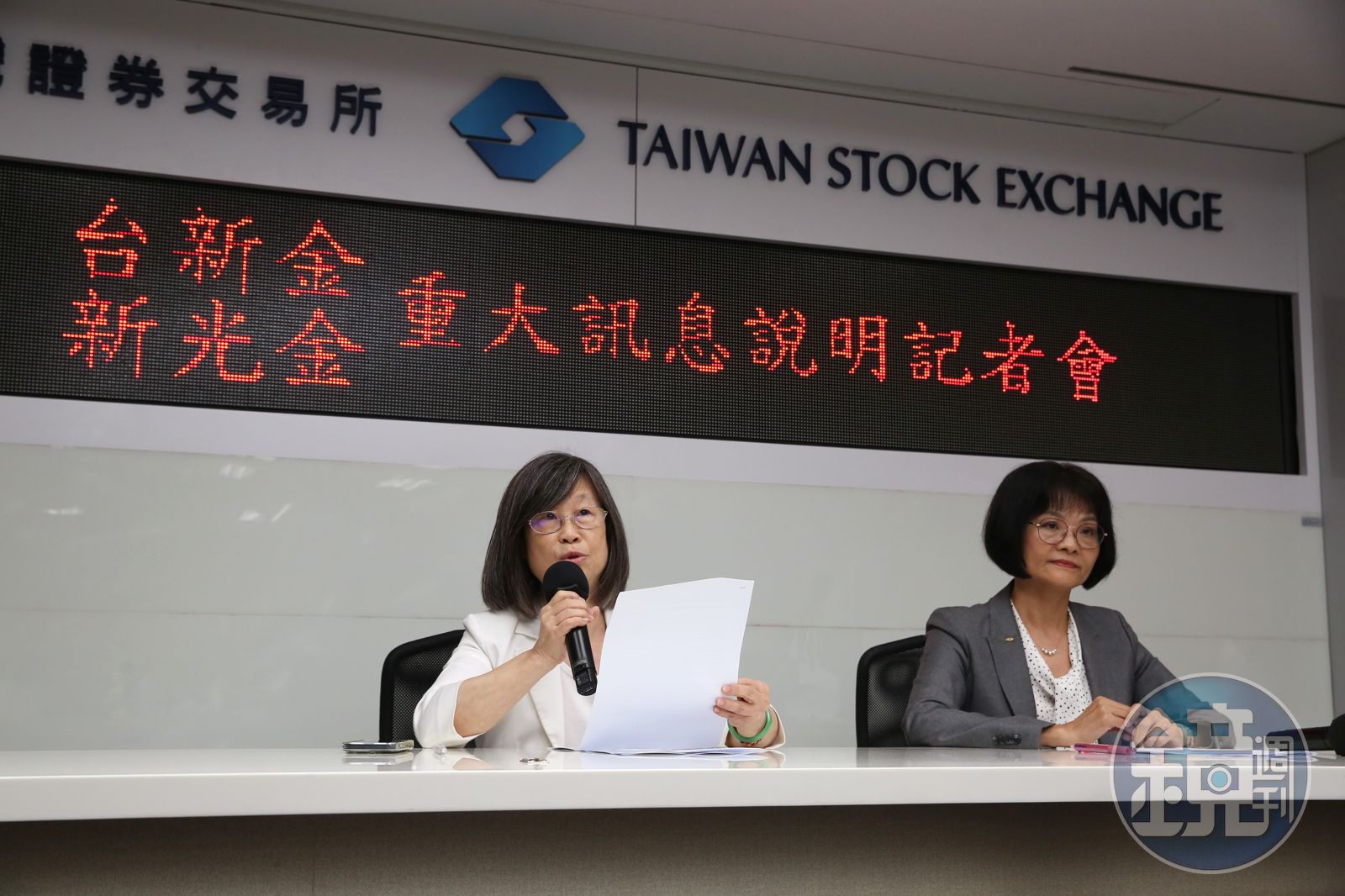 台新金與新光金22日晚間召開重訊記者會,宣布董事會通過合併案。左起為台新金財務長賴昭吟、新光金副總經理林宜靜。