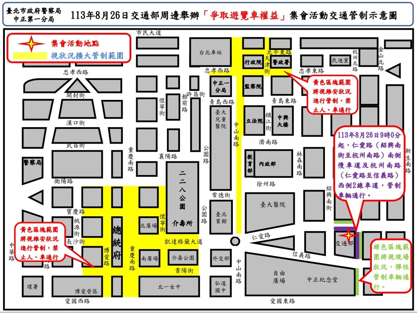 中正第一分局為維護活動交通秩序與安全,將彈性管制集會現場周邊路段,並視現場狀況及人數擴大周邊交通管制範圍,本次集會活動期間行經相關管制區域內各路線公車,由臺北市公共運輸處協調公車業者配合改道行駛,民眾如欲查詢公車改道路線,請電洽臺北市公共運輸處02-27274168(該處查詢網站)或電洽各站牌公車調度站查詢相關資訊。