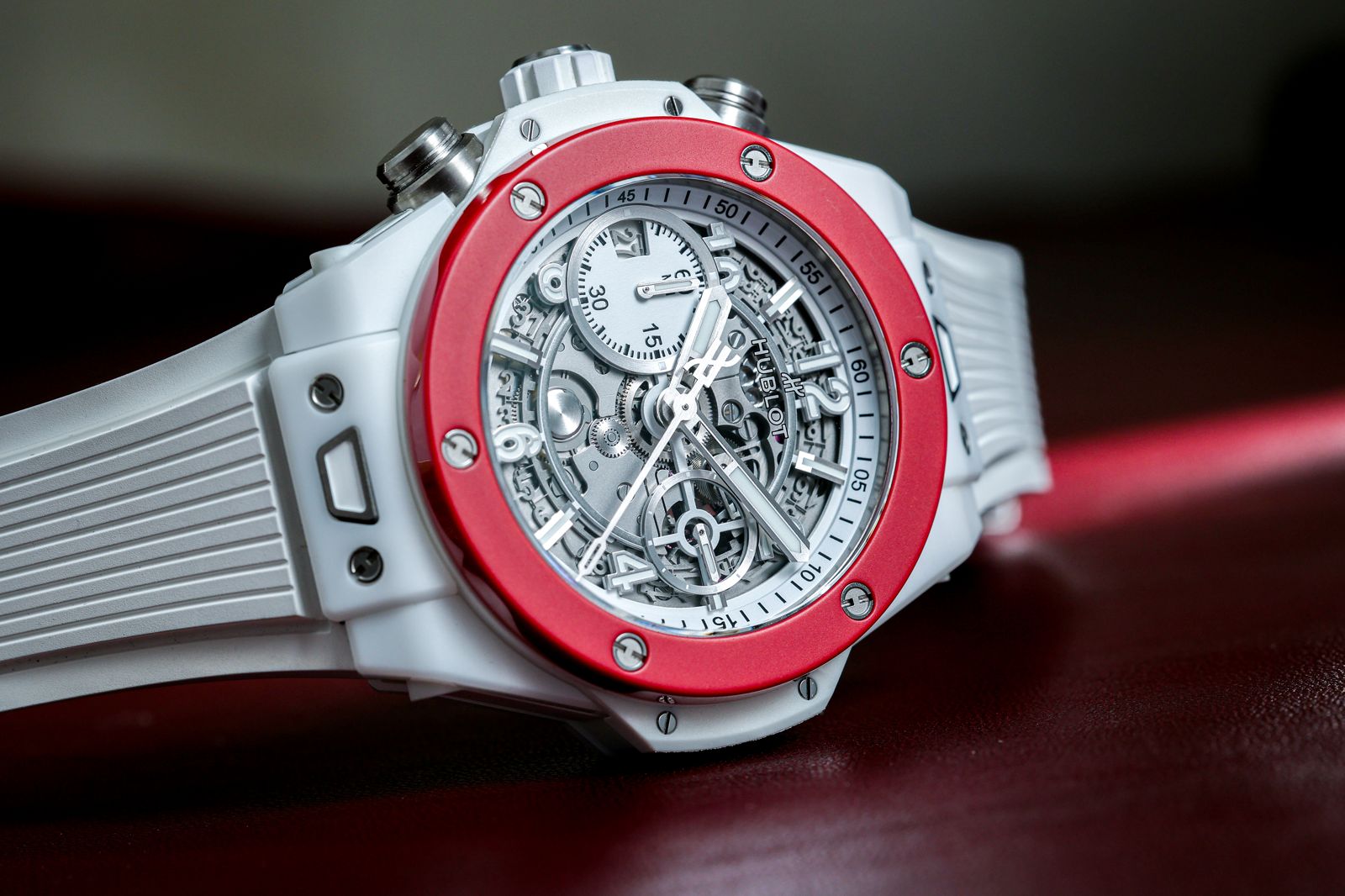事實上宇舶之前並不是沒出過左冠錶,不過在Unico機芯上是頭一遭。從2010年推出全自製的Unico計時機芯之後,這枚機芯目前已經全面使用在所有產品當中;Unico機芯具備雙擺動離合器和矽擒縱系統,而且快慢針微調系統的造型也做了更動,改成鋸齒螺絲組,上頭還能看到一個小小的H字樣。另外像是水平離合機制、飛返計時功能,前者讓機芯得以更薄(比起垂直離合),後者則是使用上更方便。