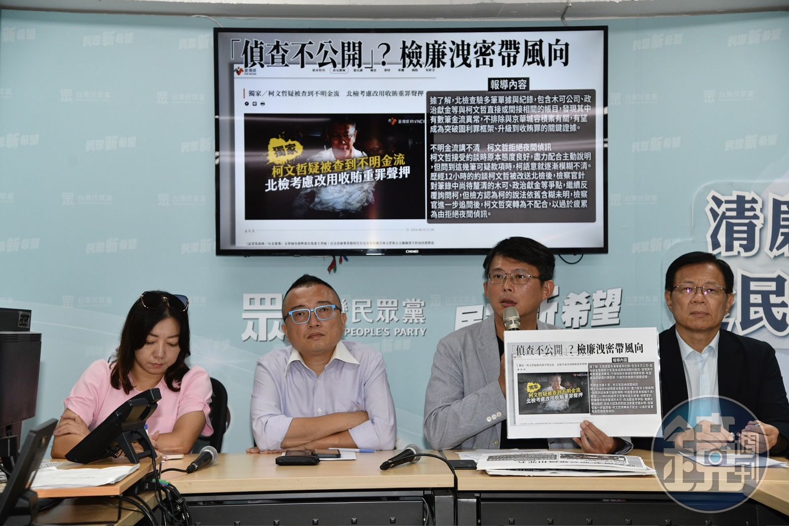 除了北檢5點強力聲明外,民眾黨上午記者會後,發言人吳怡萱宣布記者會已經結束時,有媒體詢問「外界質疑大筆現金資金流向」,吳怡萱馬上回嗆「請問東森的記者為什麼要影響記者會流程?」黃國昌則是回問「外界是誰?」「大筆現金是多少錢?」不然他不知道怎麼回答問題。