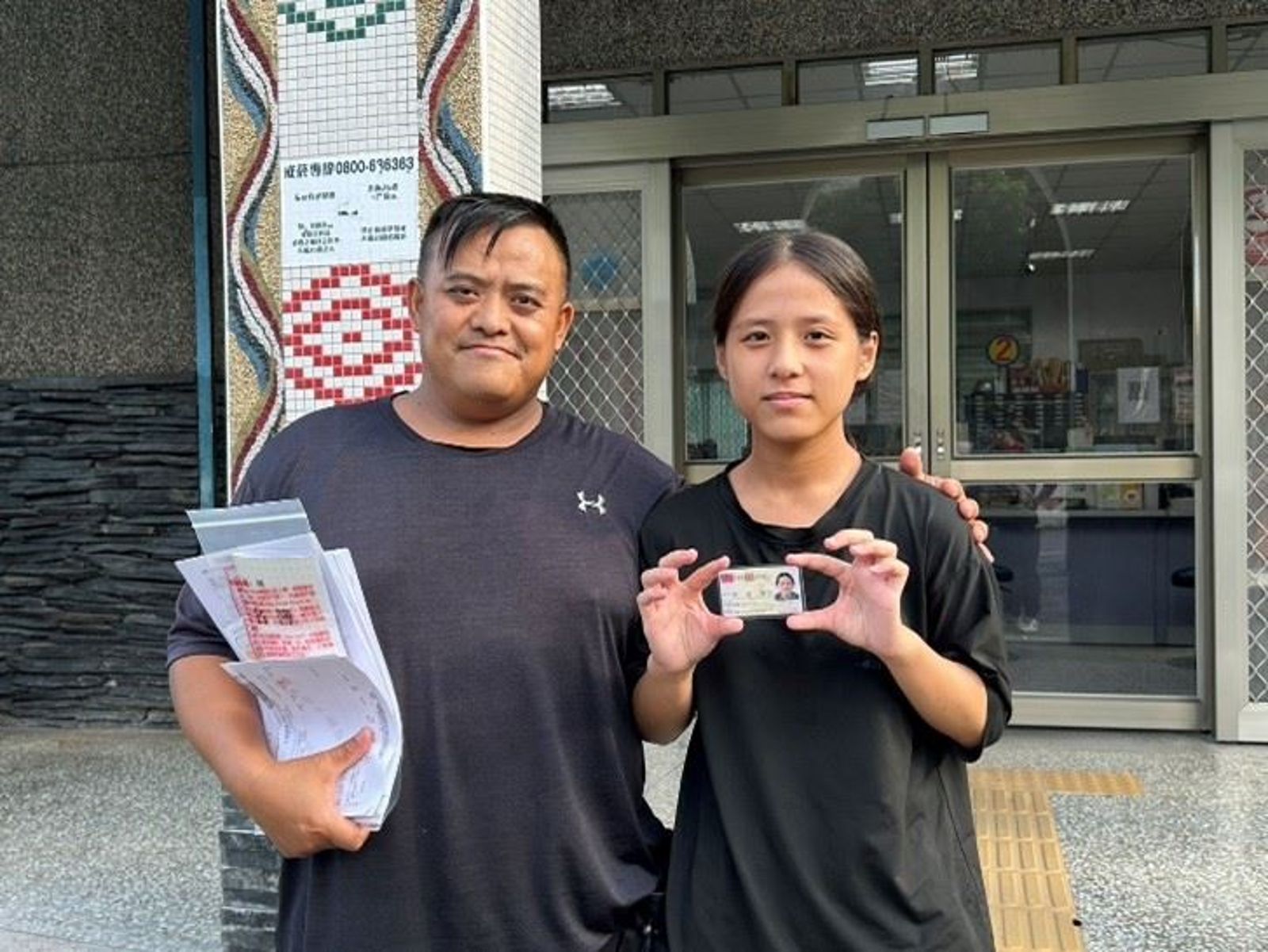 近日,收養家庭攜同少女的生父、生母一同前往戶政事務所,完成生父認領及身分登記等相關手續。鄧主任親自將新辦的身分證及登記有原住民身分的戶籍謄本交予少女時,少女激動落淚。隨行的叔叔表示:「歷經15年,終於完成了我二哥的遺願,感謝戶政人員的辛勤協助,讓這份願望得以實現。」