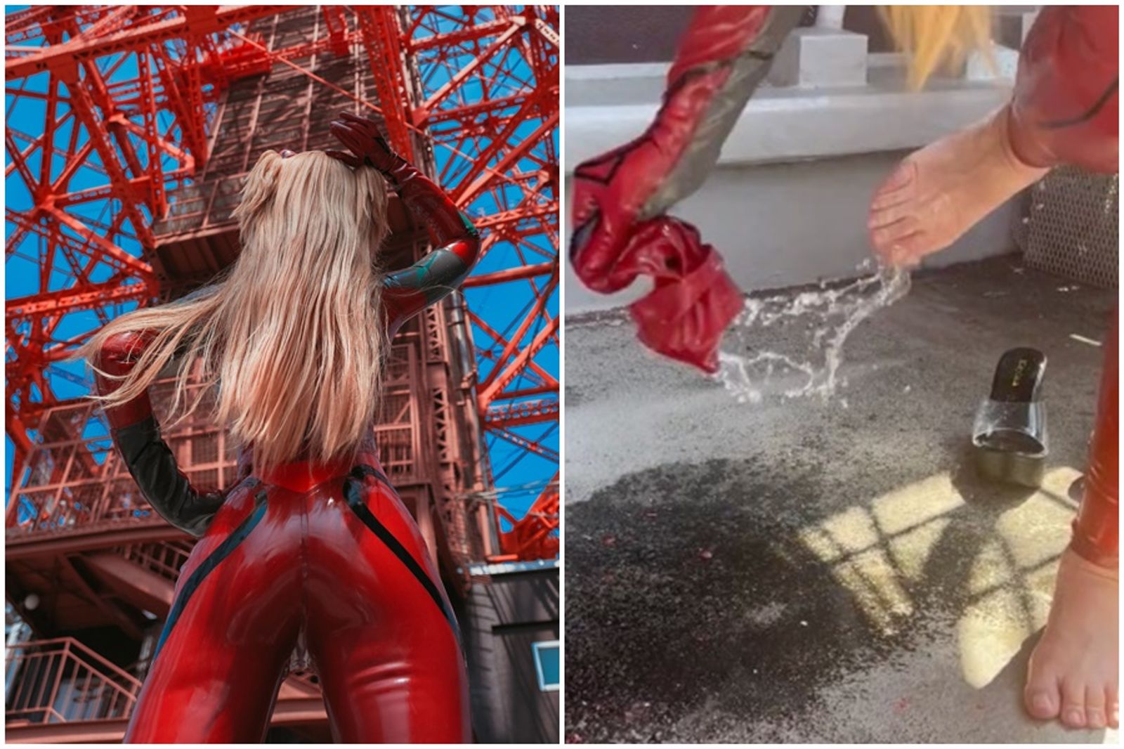 日本正妹Coser「ぐりこ」近日扮成《新世紀福音戰士》中的「明日香」角色,敬業的在豔陽高照下,於東京鐵塔拍攝長達1小時,使所有汗水都包在橡膠裝裡,脫下鞋子瞬間噴出大量汗水,誇張的6秒影片曝光,隨即吸引超過1,918萬人次觀看率。