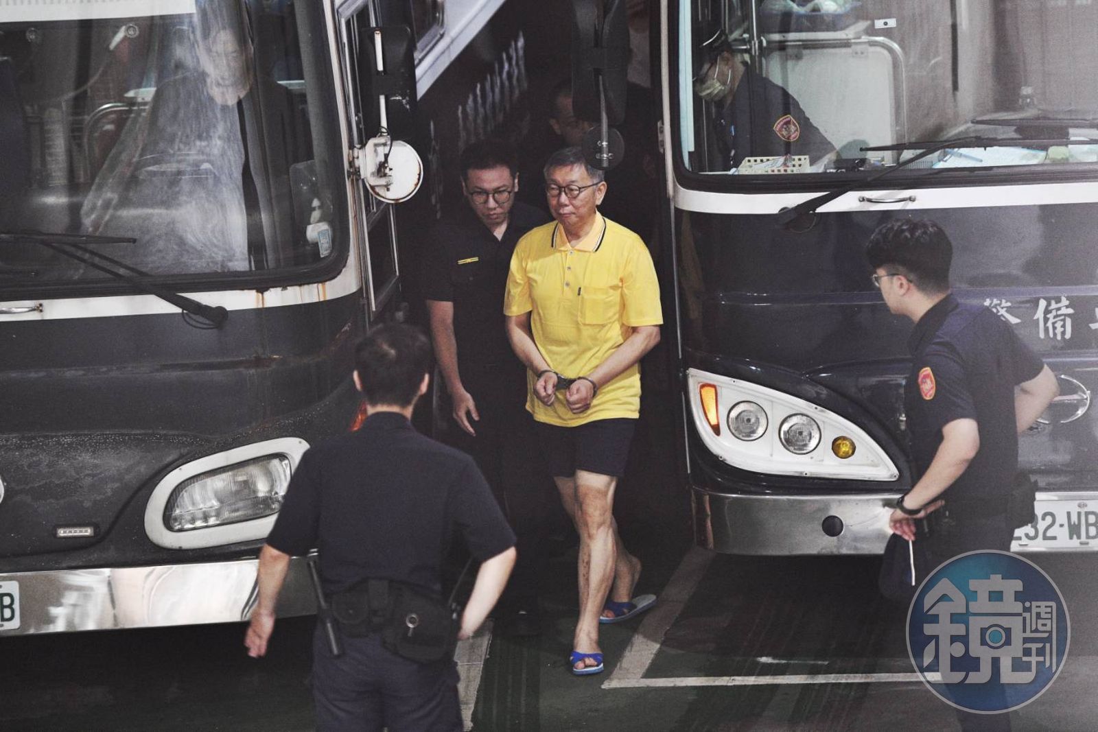 為追查金流以及釐清當時京華城容積率暴增的決策過程,檢察官今第3度提訊收押中的柯文哲,囚車上午9點20分左右抵達台北地檢署,柯文哲下車時仍腳踩藍白拖、身穿黃色囚服,沒有回應媒體詢問。
