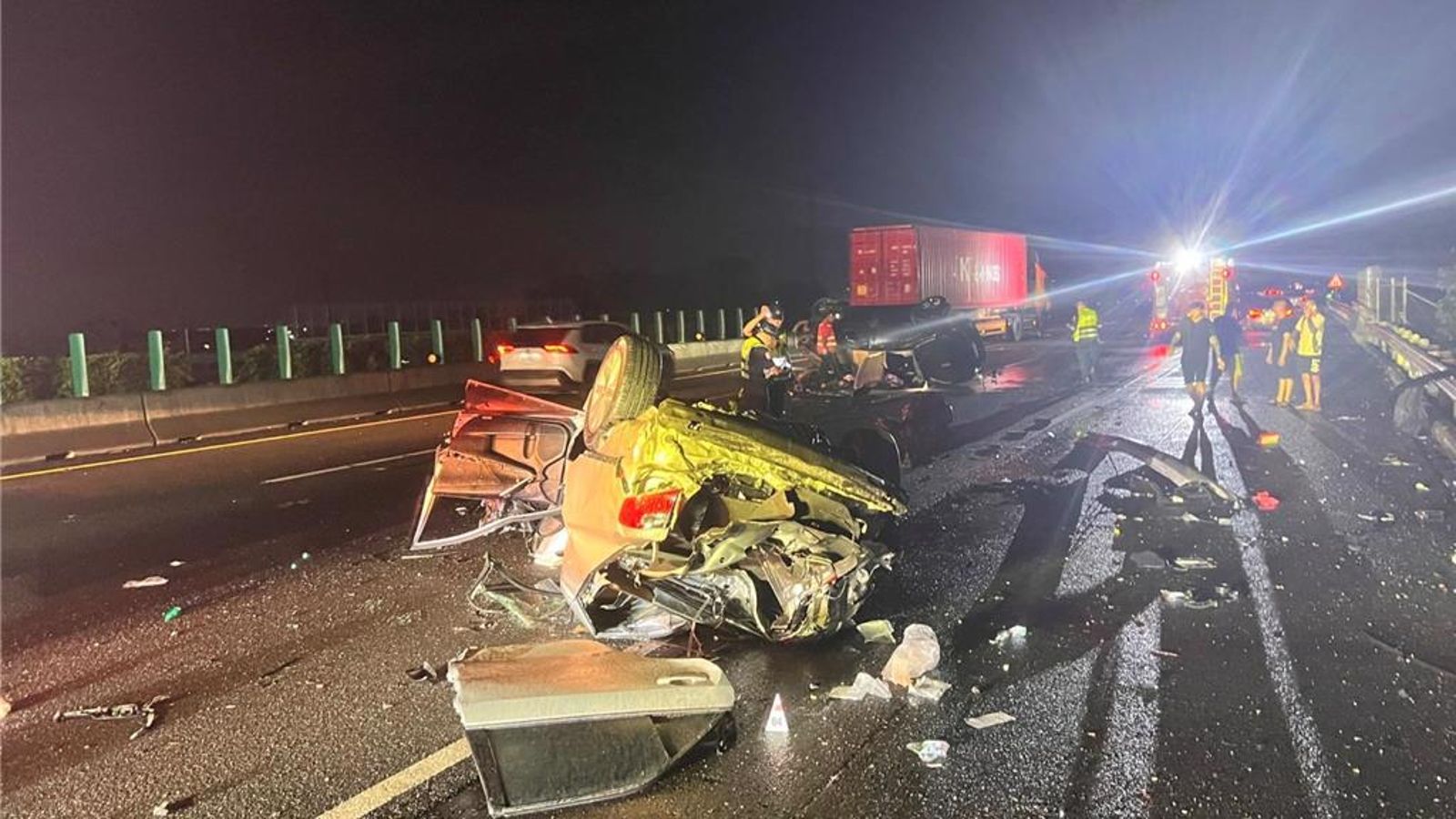 雲林縣消防局表示,昨晚10點25分接獲通報,地點位於國道1號南下237公里處,虎尾鎮往斗南鎮方向,消防局立即派遣虎尾、西螺及斗南單位的救援人員,共出動13名救援人員及2部消防車、4部救護車趕赴現場。
