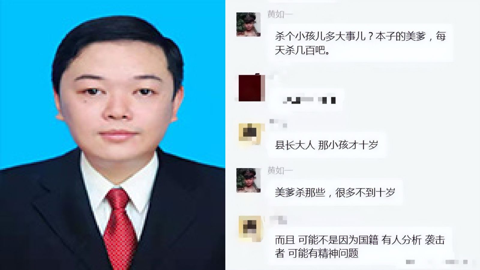 黃如一嗆說「殺個小孩多大事兒」「我們的紀律就是殺日本人」。(翻攝微博)黃如一嗆說「殺個小孩多大事兒」「我們的紀律就是殺日本人」。(翻攝微博)根據《鳳凰網》報導,他們實際致電四川省農業農村廳,確認截圖中的人就是甘孜州新龍縣副縣長黃如一,工作人員稱相關領導已下達指令,此事正全力處理中。