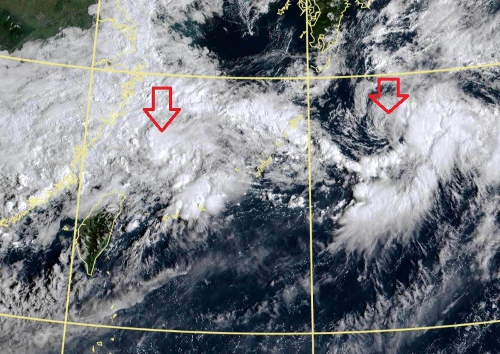 鄭明典今(24日)上午透過臉書發出衛星雲圖,畫上箭頭說明台灣附近有2個「旋轉中心」,對照模式都有掌握此2個小低壓,而左邊的又比模式預測的更明顯。