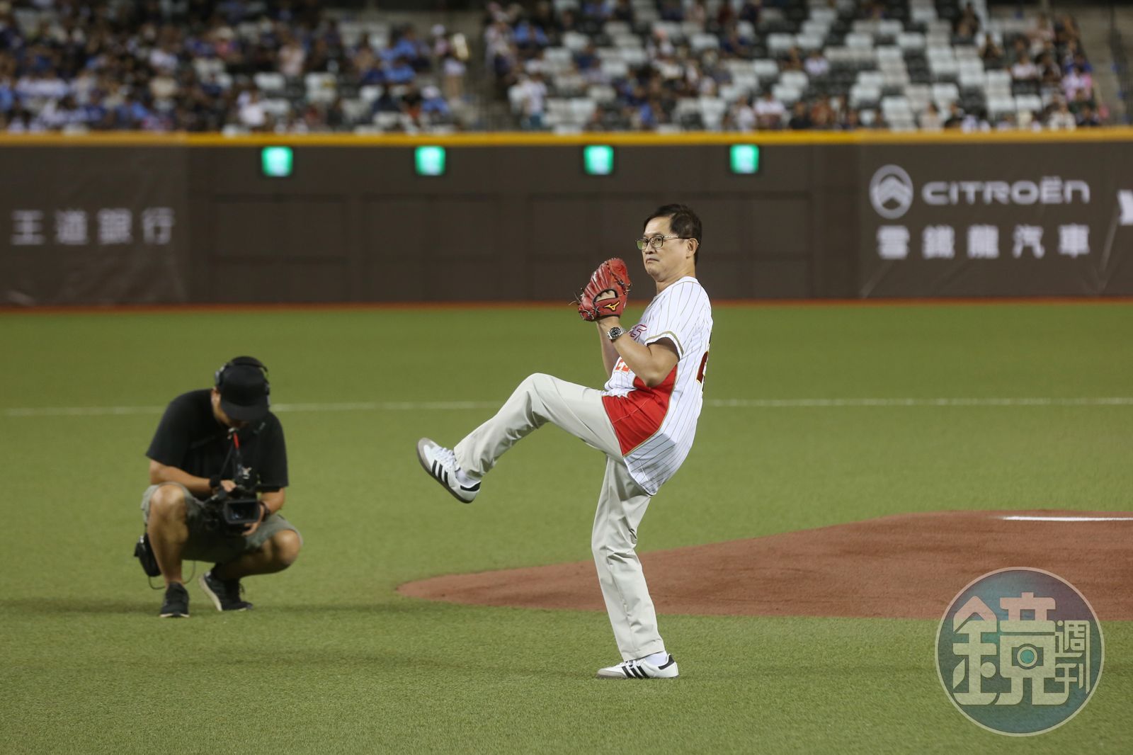 身穿代表自己生日的25號球衣的童子賢擔任投手,共同執行長鄭光志則擔任打者,他以帥氣的姿勢,投出了一個高拋球,讓捕手完美接球,現場和碩人立刻報以熱烈掌聲。下場後接受媒體訪問,童子賢坦言,今天是首度進大巨蛋看球。