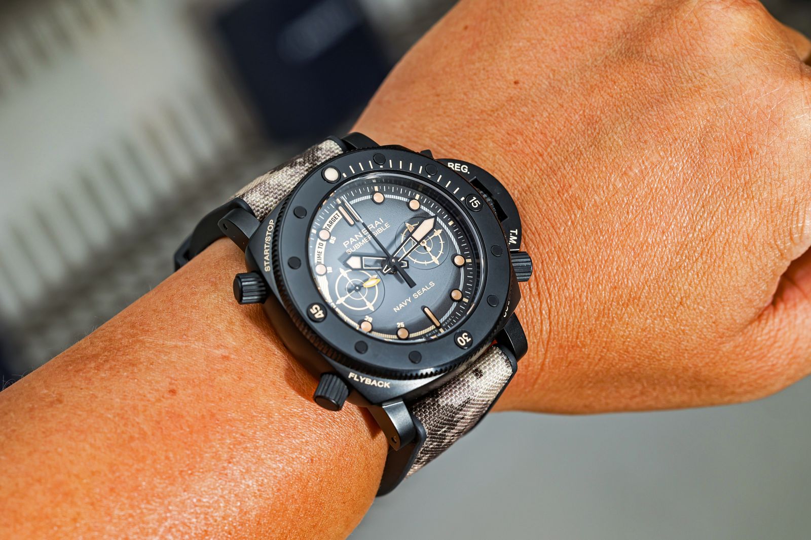 這次 Navy SEALs主題錶款中唯一一款限量版的是這只PAM01521,也是單價最高的一款,具備飛返計時功能,而且過去沛納海配備飛返計時的款式,都會在6點鐘位置打上「FLYBACK」字樣來正名,不過因為有Navy SEALs了,所以FLYBACK被挪到了8點鐘位置的錶殼上,也剛好增加了使用上的便利性。還有一個小巧思,是他面盤外側的左半邊增加一個倒計時的刻度,並且在最後寫下「TIME TO TARGET」,營造出猶如執行軍事任務一般的氛圍。