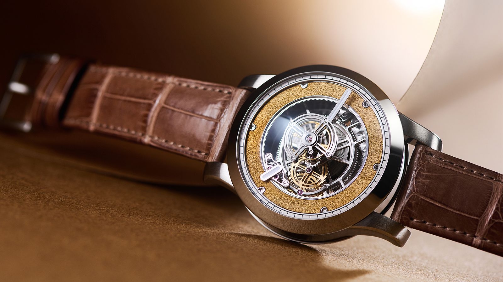 而經典的圓拱形水晶錶鏡是超大面的藍寶石玻璃,經過特殊技術處理的鏡面,能在各角度都無遮蔽式地看見中央陀飛輪的運作,通透到彷彿像是沒有錶鏡一樣的視覺感非常令人驚豔,搭配五級鈦金屬錶殼,讓它在視覺和重量上都具有輕透效果般的相得益彰。