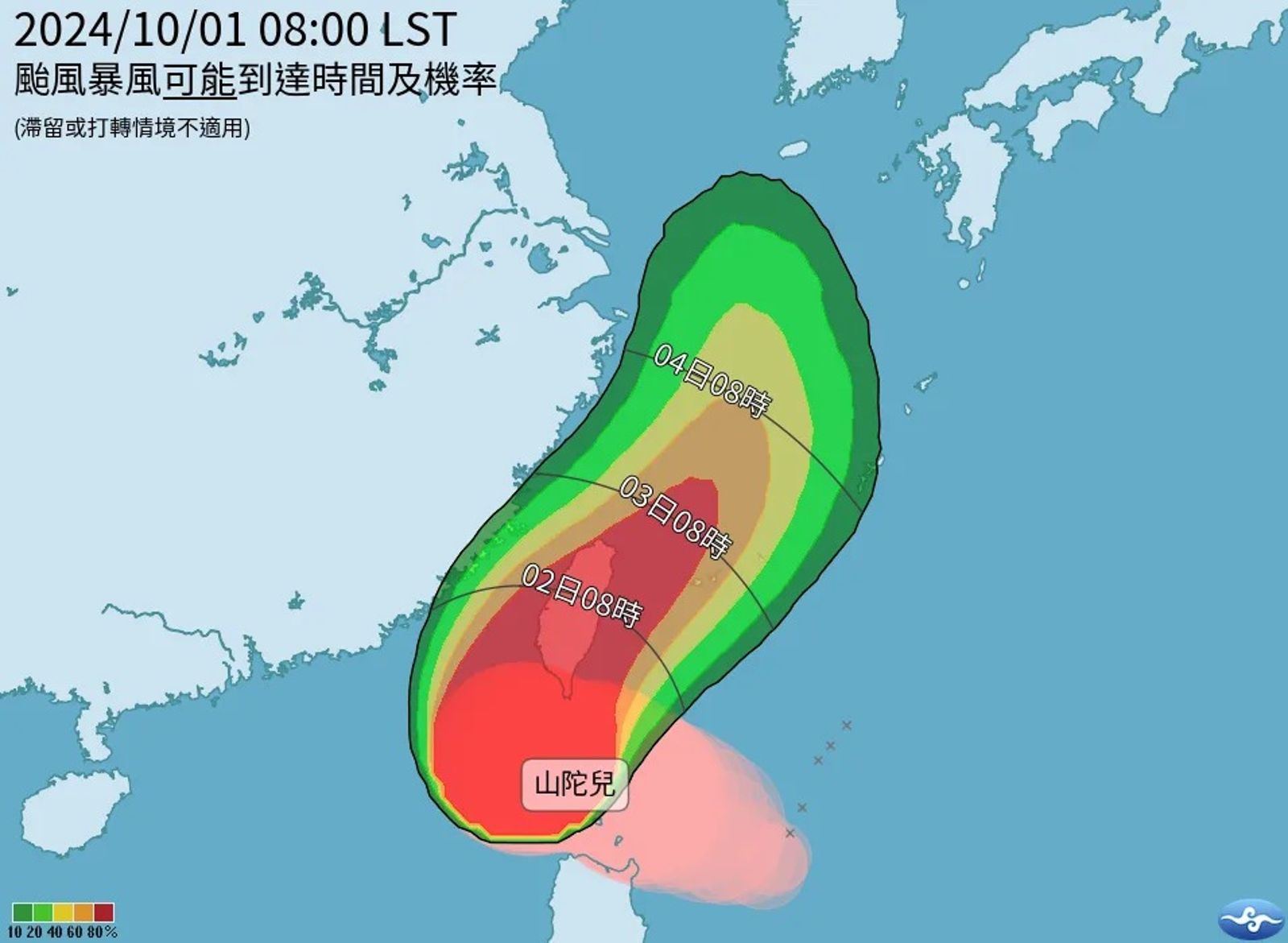 對此,氣象署也公布各主要城市及離島「120小時颱風暴風侵襲機率」,高雄市、屏東縣及恆春半島達100%;嘉義縣市、台南市及台東縣99%;雲林縣、南投縣及花蓮縣98%;而彰化縣、台中市、苗栗縣、宜蘭縣及澎湖縣則有90%以上。