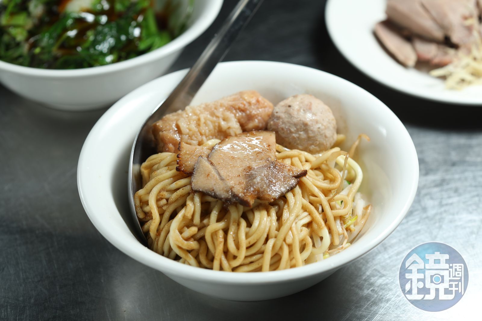 「乾麵」醬香迷人,還吃得到每天新鮮製作的雞捲、丸子和肉片。(70元/小碗)吃麵一定要配小菜,Josh尤其喜歡「豬舌」和「豬尾巴」。理由是店家把舌苔處理得很乾淨,呈現Q脆又好咀嚼的口感,豬尾巴同樣沒異味,還能吃到類似豬腳的膠質和骨頭香氣。