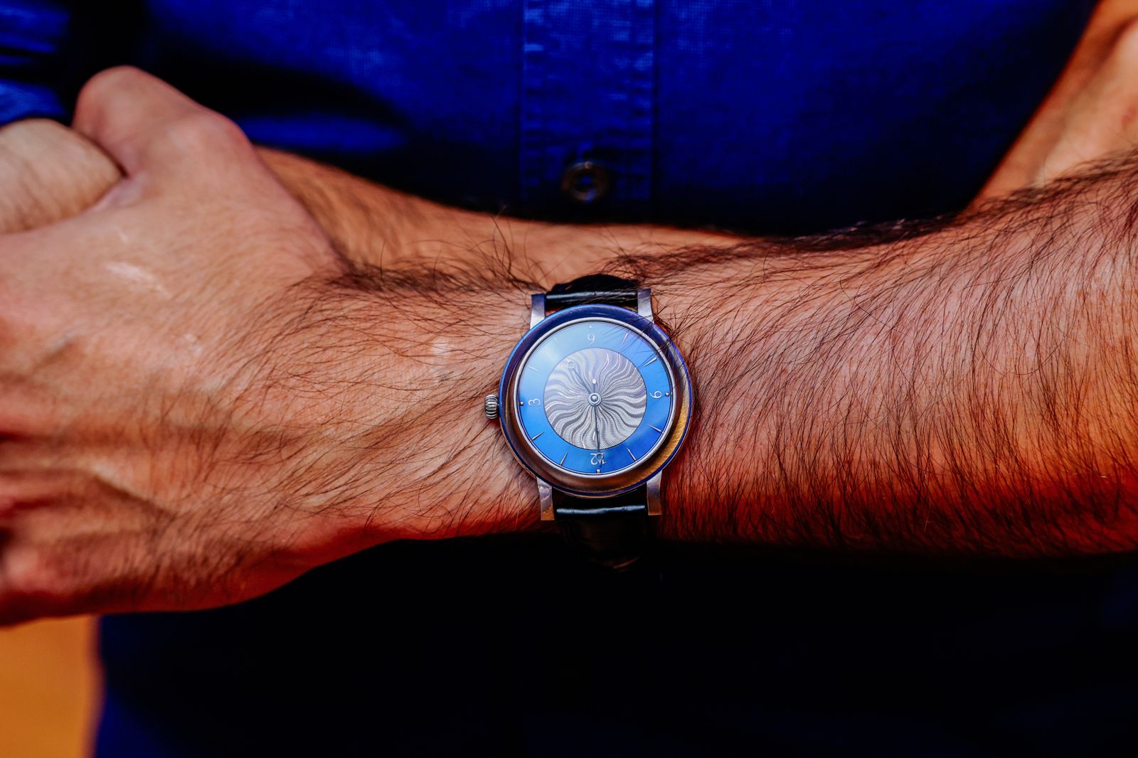 問到他製作過程裡最困難的是哪一項?他說如果是他手上的那一款來說,最困難的是藍寶石水晶鏡面。什麼?我到底聽了什麼?鏡面也歸你管?他說其實最早用的是平面藍寶石水晶玻璃鏡面,但成品出來後不甚滿意,可是也由於時間太趕、沒有人願意製作圓拱形(Dome)的鏡面,所以就去朋友的公司,把心目中理想的錶鏡給做出來。說到這,你應該有發現Julien瘋狂在哪了吧?