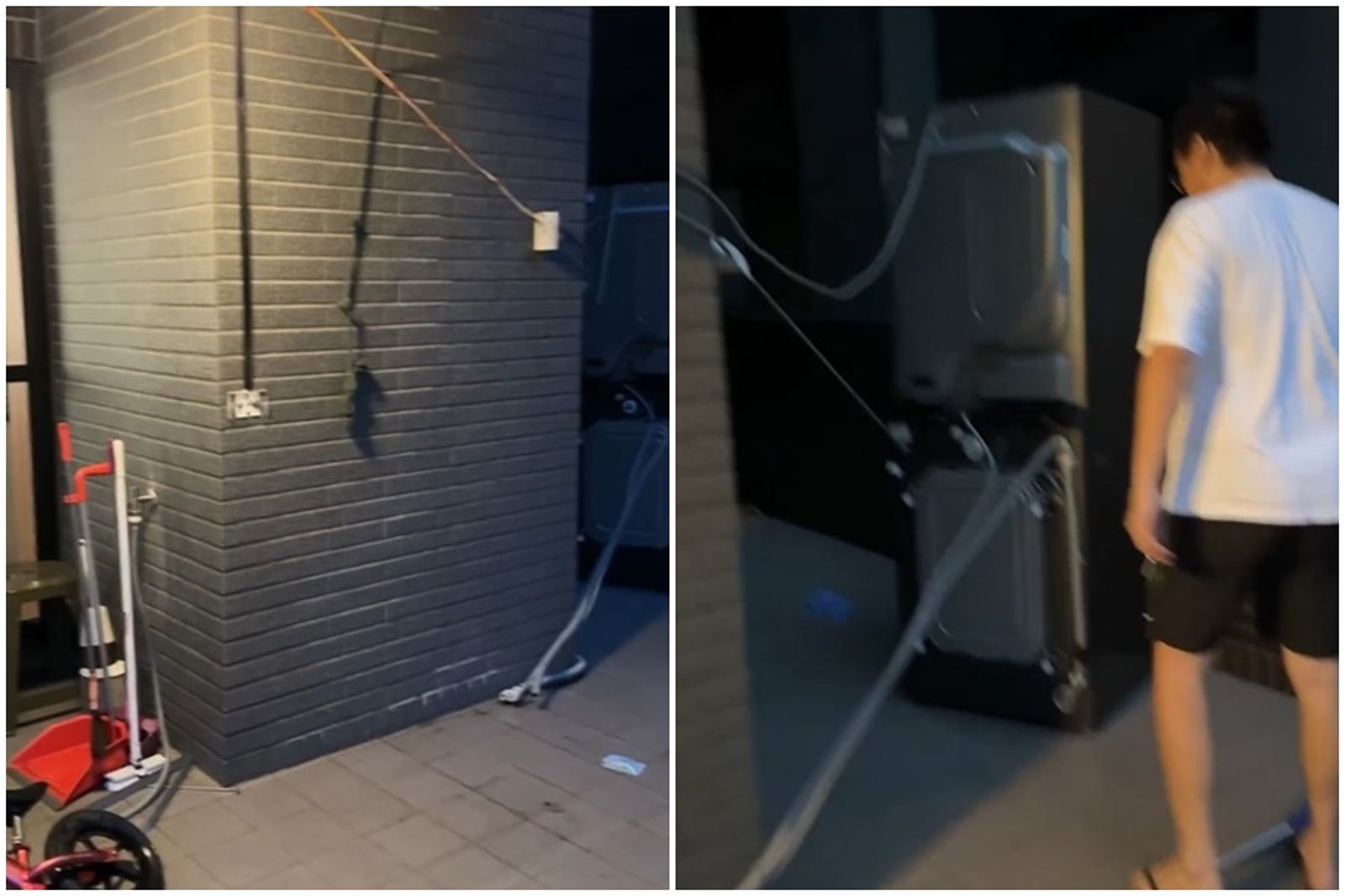 一位居住在高雄的女民眾昨晚在社群分享短片,傻眼表示去了一趟好市多,回家發現露天陽台的超重雙層洗衣機,竟被強風吹到繞彎90度移至另一角,好在電線插頭跟水管等管線沒完全鬆脫,只有一條線電源被吹斷,否則洗衣機可能真的會離家出走,「颱風還沒進來就這樣,進來了一定更恐怖!」