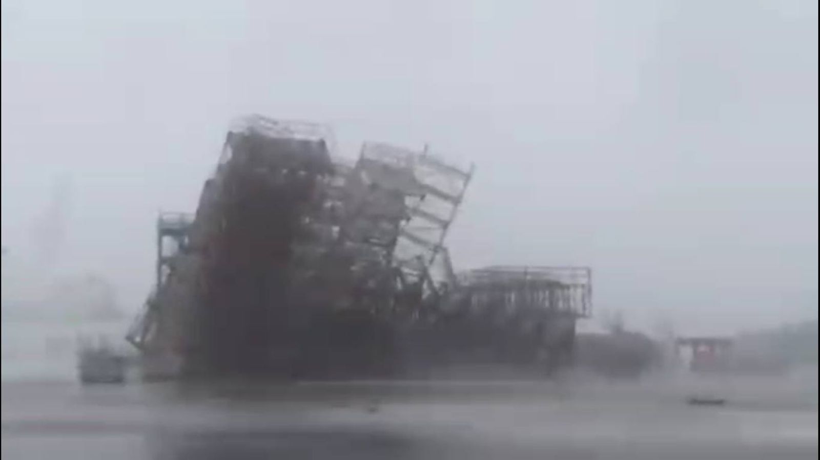 影片可見,降雨在強風吹拂下已經讓畫面整個霧茫茫,發出驚人聲響,而重達數十噸的鐵製鷹架,就這樣被狂風「吹倒」,應聲墜地。