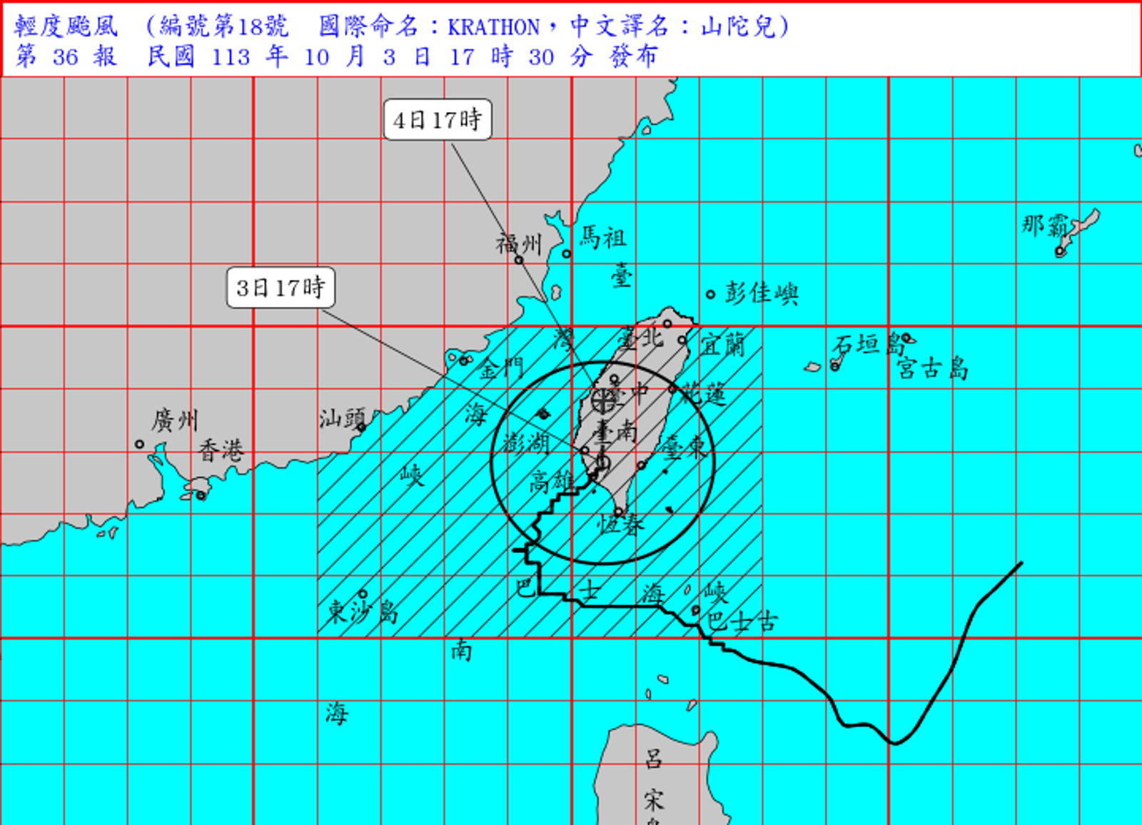 目前陸上警戒區域:桃園、新竹、苗栗、台中、彰化、南投、雲林、嘉義、台南、高雄、宜蘭、花蓮、台東、屏東、恆春半島、澎湖應嚴加戒備。海上警戒區域:台灣海峽、台灣東北部海面、台灣東南部海面、巴士海峽、東沙島海面航行及作業船隻應嚴加戒備。此外,新北市、基隆市須注意降雨警戒。