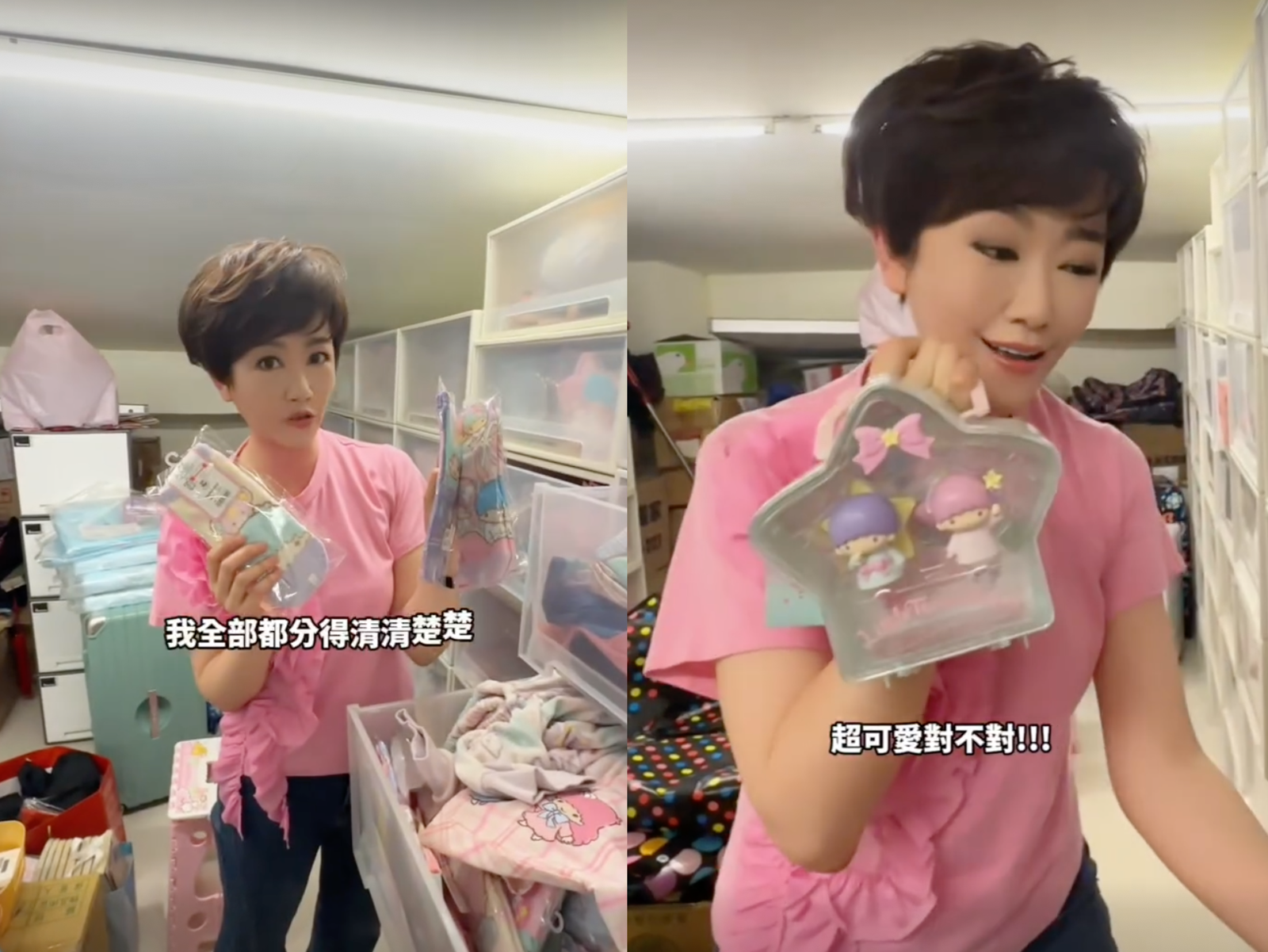 結果一個月後,果然她滿足了網友的願望,開箱介紹究竟自己擁有哪些「雙星仙子」相關的收藏品,期間從她就讀幼兒園開始到現在,已經不知不覺過了幾十年,範圍包括了行李箱、包包文具、玩偶、化妝品,乃至於3C配件等。其中有些實用價值相當高,像是服飾、襪子、枕頭、手錶、飾品、鏡子、棉花棒、電風扇等等;但也有些就是可愛至上的玩偶,買來就是為了可愛又好看,保守估計花費了200萬元。