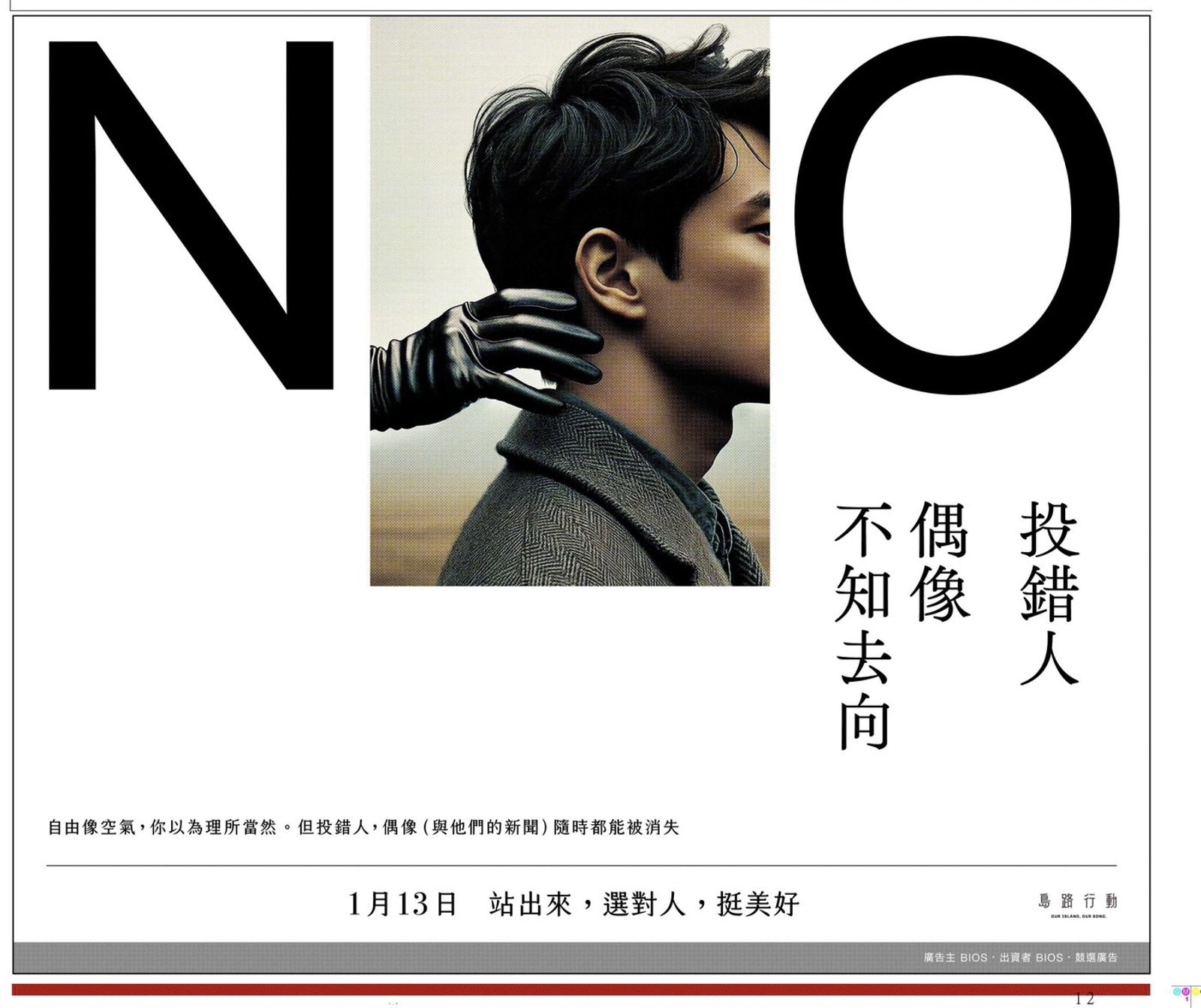 娛樂版報導許多藝人、偶像新聞,但在報紙下方的半版廣告,醒目的黑白大字寫上「NO」,並有一位側臉精緻的男子,被不知名黑手從背後掐住脖子,搭配文案強調「自由像空氣,你以為理所當然。但投錯人,偶像(與他們的新聞)隨時都能被消失」,就是指出若讓親中政黨獲得權力,未來的文化、娛樂都將不再自由。