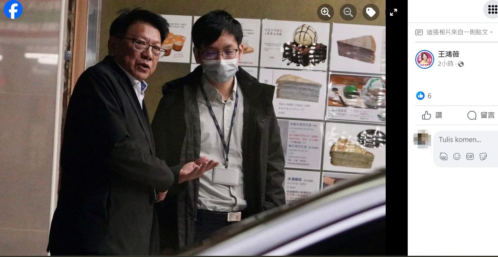 王鴻薇在臉書貼出照片控訴民進黨違反行政中立,莊仁祥在上班時間和民進黨競選幹部相會。(翻攝王鴻薇臉書)張志豪說,國民黨自己心是黑的,看什麼事都是黑的,用跟監、偷拍手法,一再看圖說故事,宛如警總再現。反觀朱立倫、侯友宜去年在景美夜會柯文哲涉嫌搓圓仔湯才是密謀,甚至侯友宜曾遭媒體人爆料500萬喬議員初選才是陰謀。