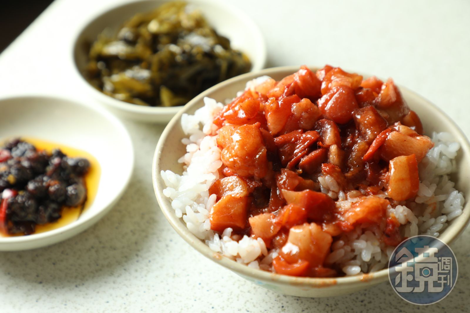 雖然我愛吃全肥的滷肉飯,但肉燥飯一上桌時,我有嚇一跳。大塊肉丁肥到我覺得會血管阻塞,顏色紅通通,是因為加了紅糟下去滷。不過吃進嘴裡,卻沒有肥膩感,很綿軟油潤,紅糟也只是增添色澤,味道不會太搶戲。另外免費提供略甜的酸菜和鹹香的豆豉辣椒變化味道,加了解膩又開胃。