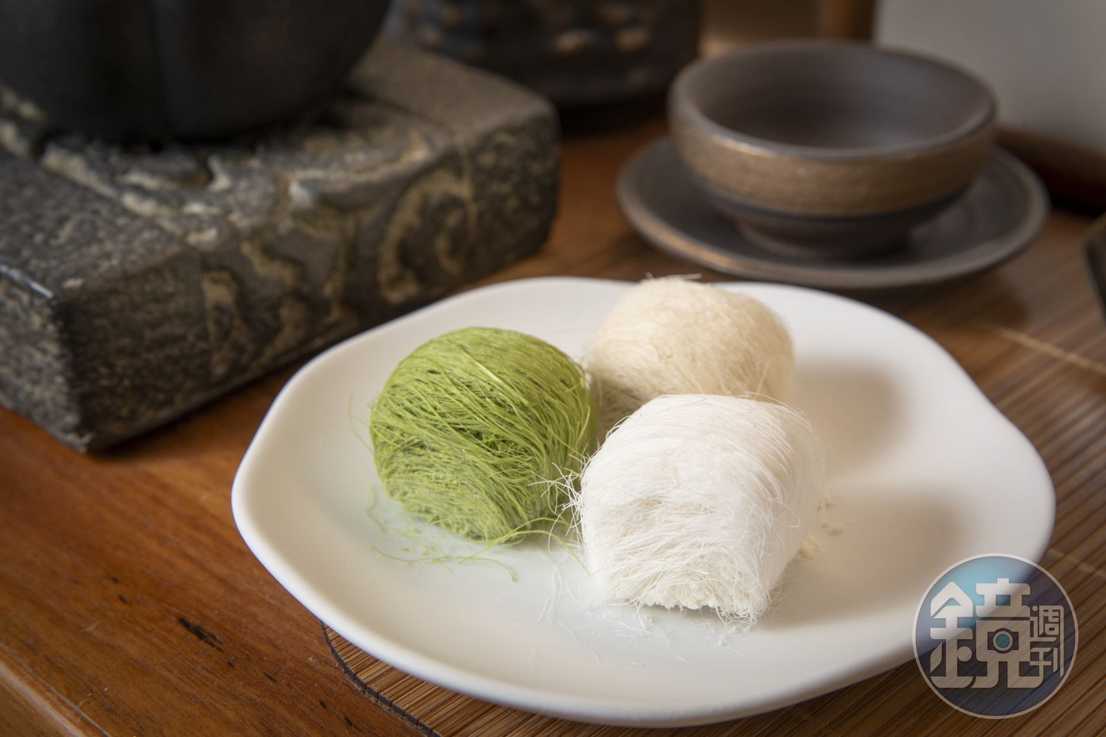 顏志全大方分享他研發的心路歷程,「就是把它分開來處理」,先把抹茶取出,透過低溫乾燥方式把它濃縮,再加進龍鬚糖,「當然也試過各式各樣的方式,慢慢實驗出來的」。