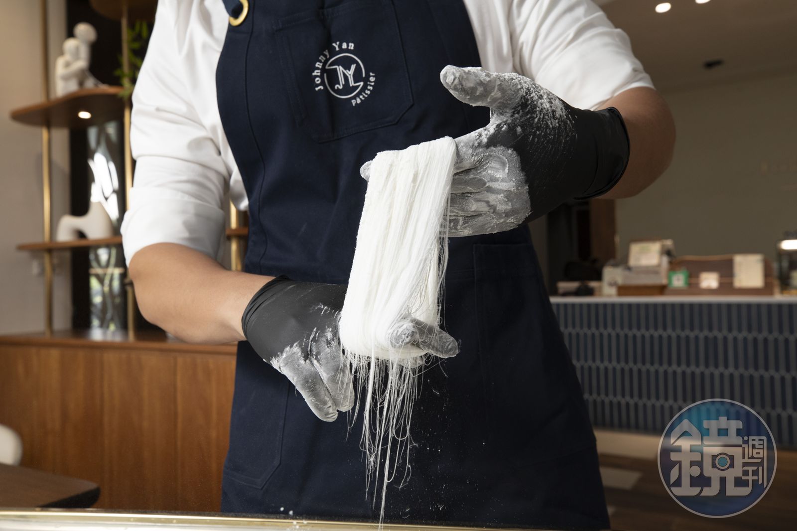 顏志全解釋:「一般的龍鬚糖吃起來很綿,跟軟糖比較像,但法式龍鬚糖透過將糖溫度煮高,回到室溫狀態時就會越硬。」鑽研糖果工藝多年的他分析,當製作時的糖溫度夠高,回到室溫中就能維持硬硬的狀態,也不會在一段時間後年在一起,「當然濕度也有關係,我們會放乾燥劑讓他濕度隔離出來」。