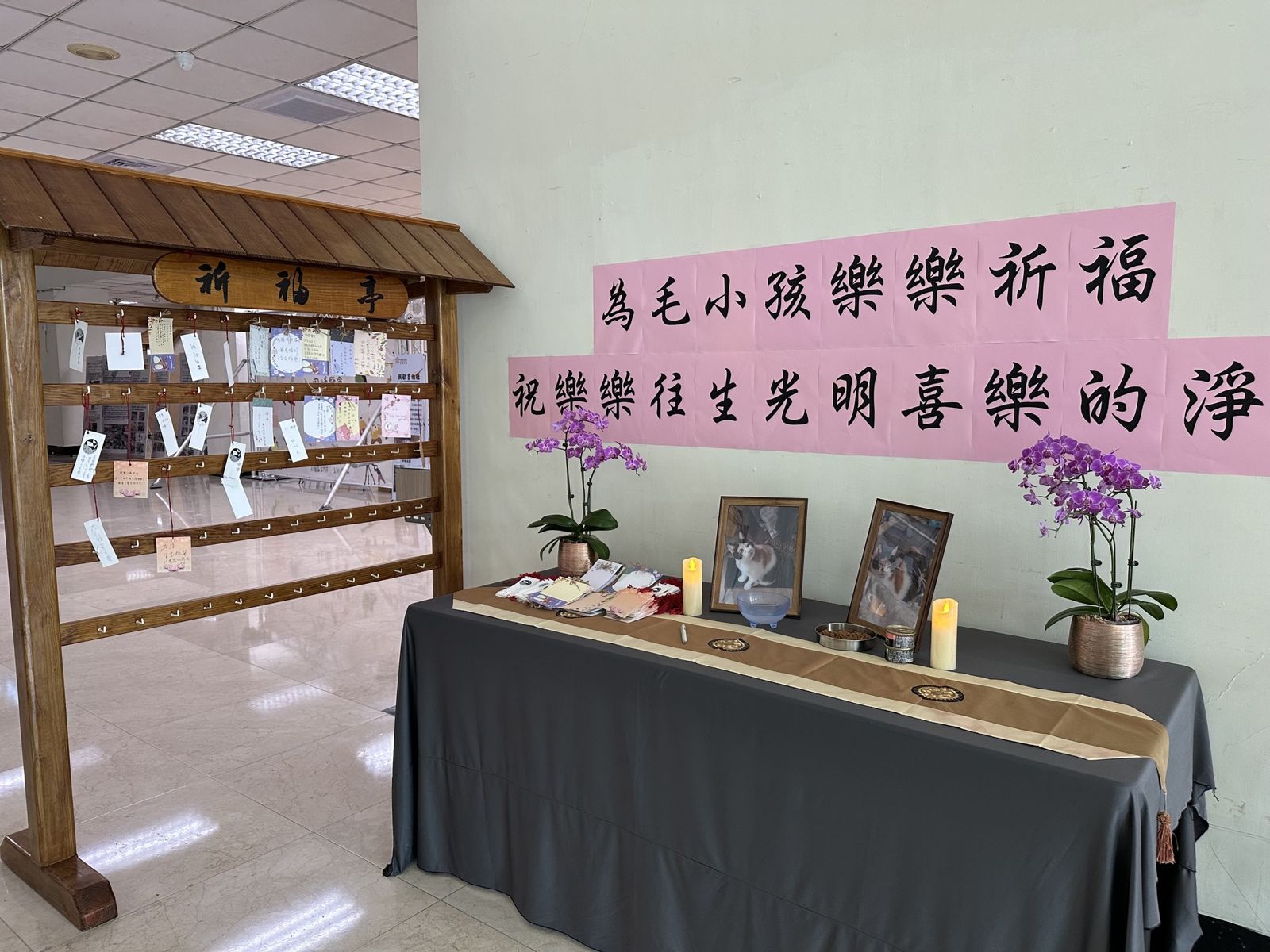玄奘大學表示,日前所發生張姓同學涉嫌虐貓個案,學校教職員生深感痛心,對於受虐小貓,更是萬分不捨,因此在圖書資訊大樓1樓為毛孩樂樂設置祈福亭,祝毛孩樂樂往生光明喜樂淨土。
