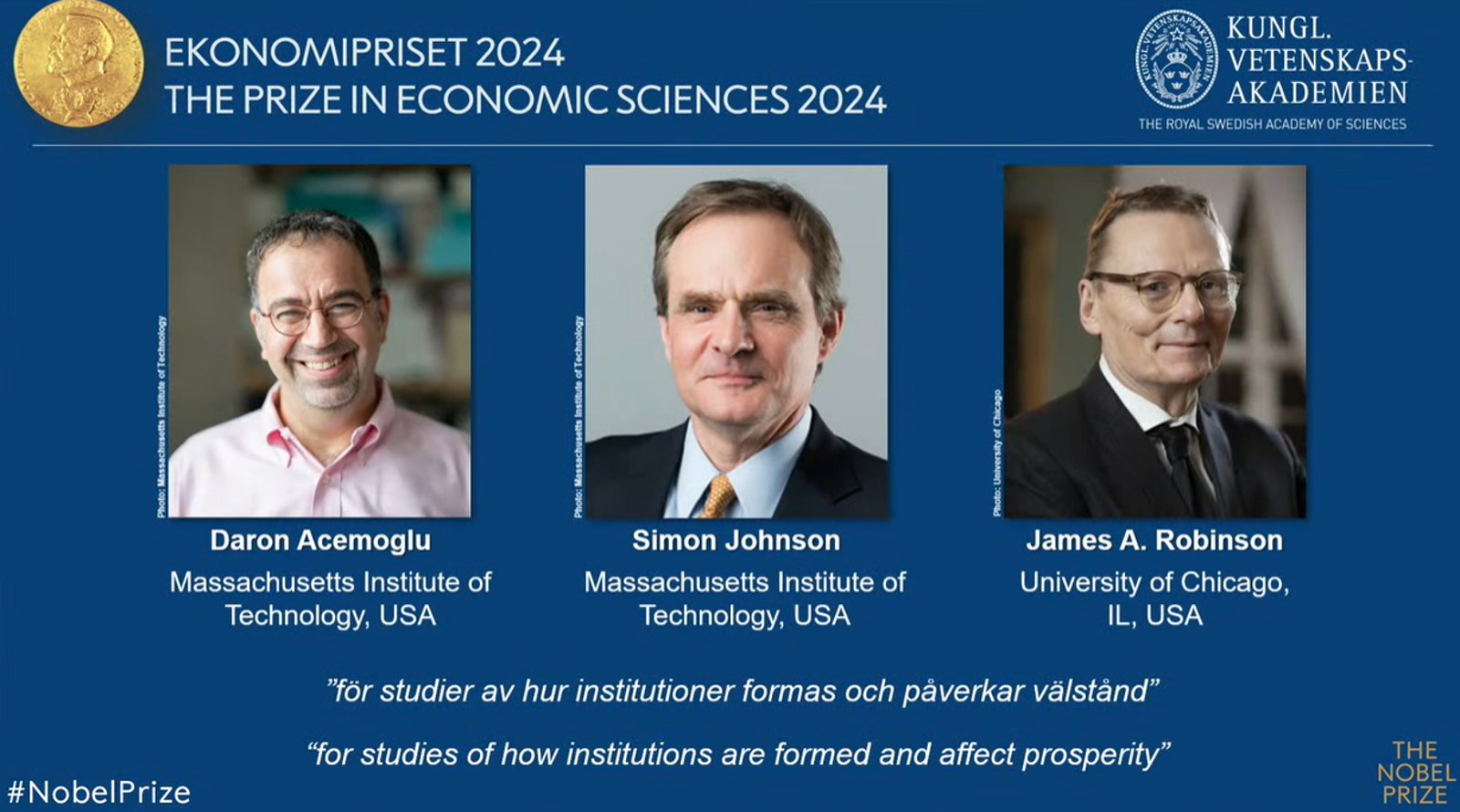 諾貝爾大會指出,這3位學者的研究,協助我們了解各國繁榮發展的差異。例如過去歐洲國家殖民了大多數的全球國家,但是後來這些地方都發生社會性變化,甚至有戲劇性變化。這些學者的研究,在於理解長期遭剝削,以及缺乏制度國家,會有怎樣的社會體制發展或變化,以及後續影響。並進一步研究國家的制度改革,如何影響國家的繁榮變革。
