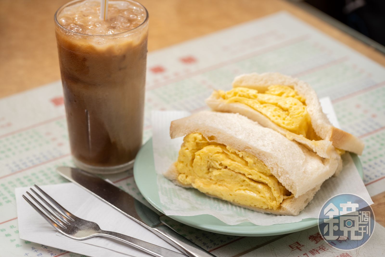 這裡最熱鬧的是早餐和下午茶時段,幾乎座無虛席,菜單墊在玻璃下,洋洋灑灑好幾十項,三文治、麥片、通粉、焗飯、炒麵、湯麵、中式飯類、日式烏冬麵、會意粉應有盡有,但許多人專為他家的「雞蛋三文治」而來。