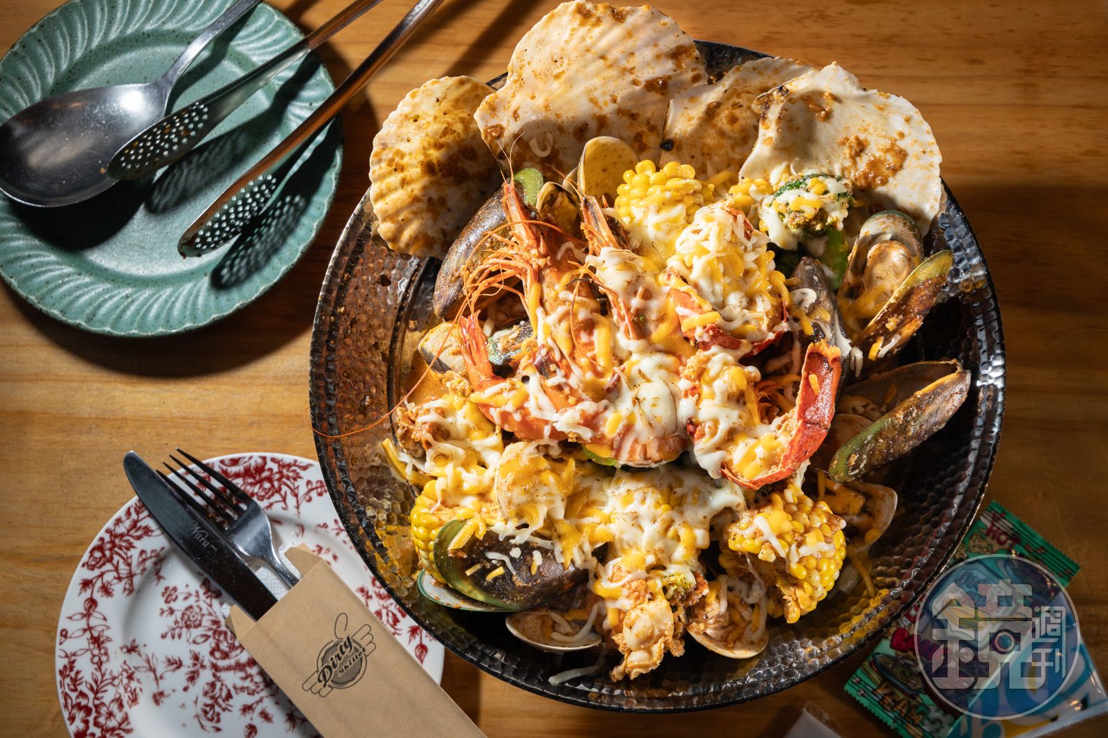 奧爾良風格的Shake Shake海鮮袋,裝滿龍蝦尾2隻、大蝦2隻、帆立貝4隻、馬蹄蛤、淡菜、西班牙腸、玉米與花椰菜,3到4人分食剛剛好。上桌前,店員會在桌邊進行搖袋表演最後再點火炙燒,拉絲的起士蓋滿海鮮,配上新奧爾良辣汁,每一口都濃郁又罪惡。