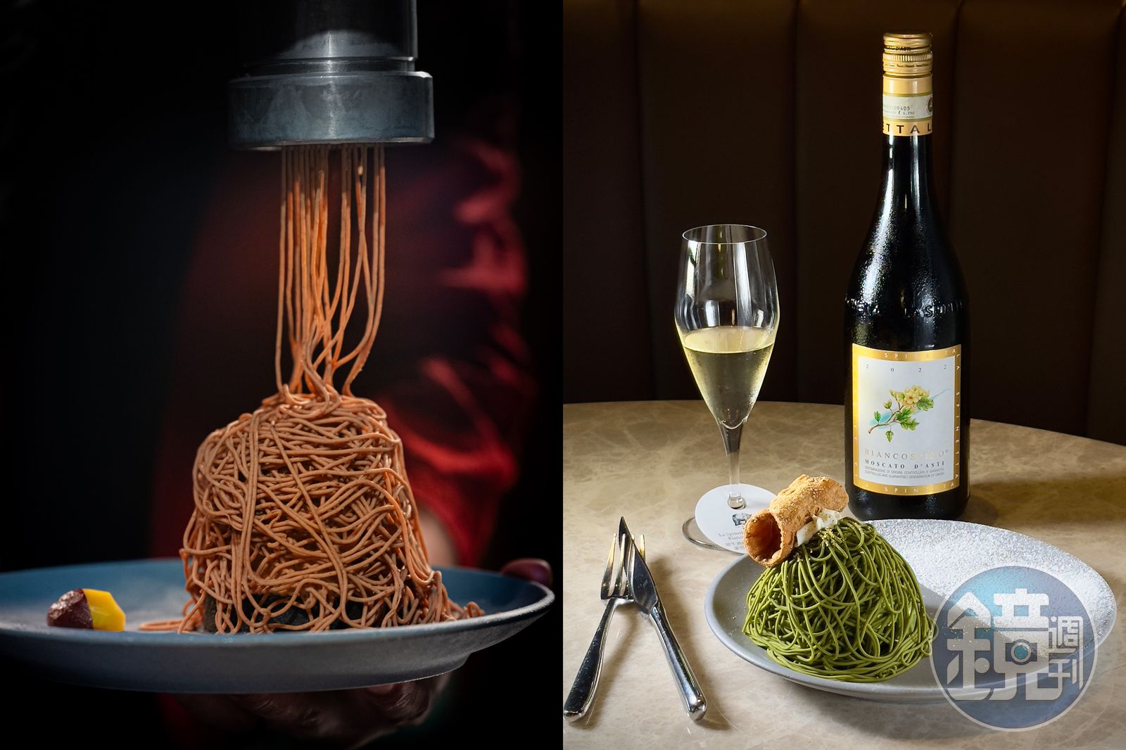 向經典電影《教父》致敬的另一道甜點「教父.蒙布朗」,內餡以卡諾里捲的瑞可達起司搭配文山包種茶Gelato,外層淋上濃郁抹茶泥,抹茶和糖漬橘皮的搭配,讓這道甜點完整彰顯主廚的巧思。