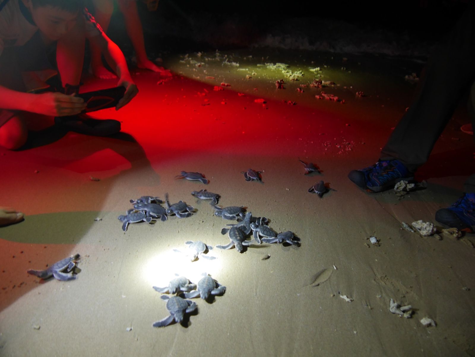 墾管處與生態志工於海龜孵化數天前即共同展開巡查監測行動,昨晚經由通報獲知小海龜孵化入海過程受困珊瑚礁石堆,與海保署聯繫商討後,決定立即投入救援行動,公私參與人員共20名,歷經2小時救援受困珊瑚礁石及沙堆共32隻小海龜,發現總卵數78顆,孵化63顆,未孵化15顆,過程中大家全心全力投入,除完成救援工作外,也上了寶貴的生命教育一課。