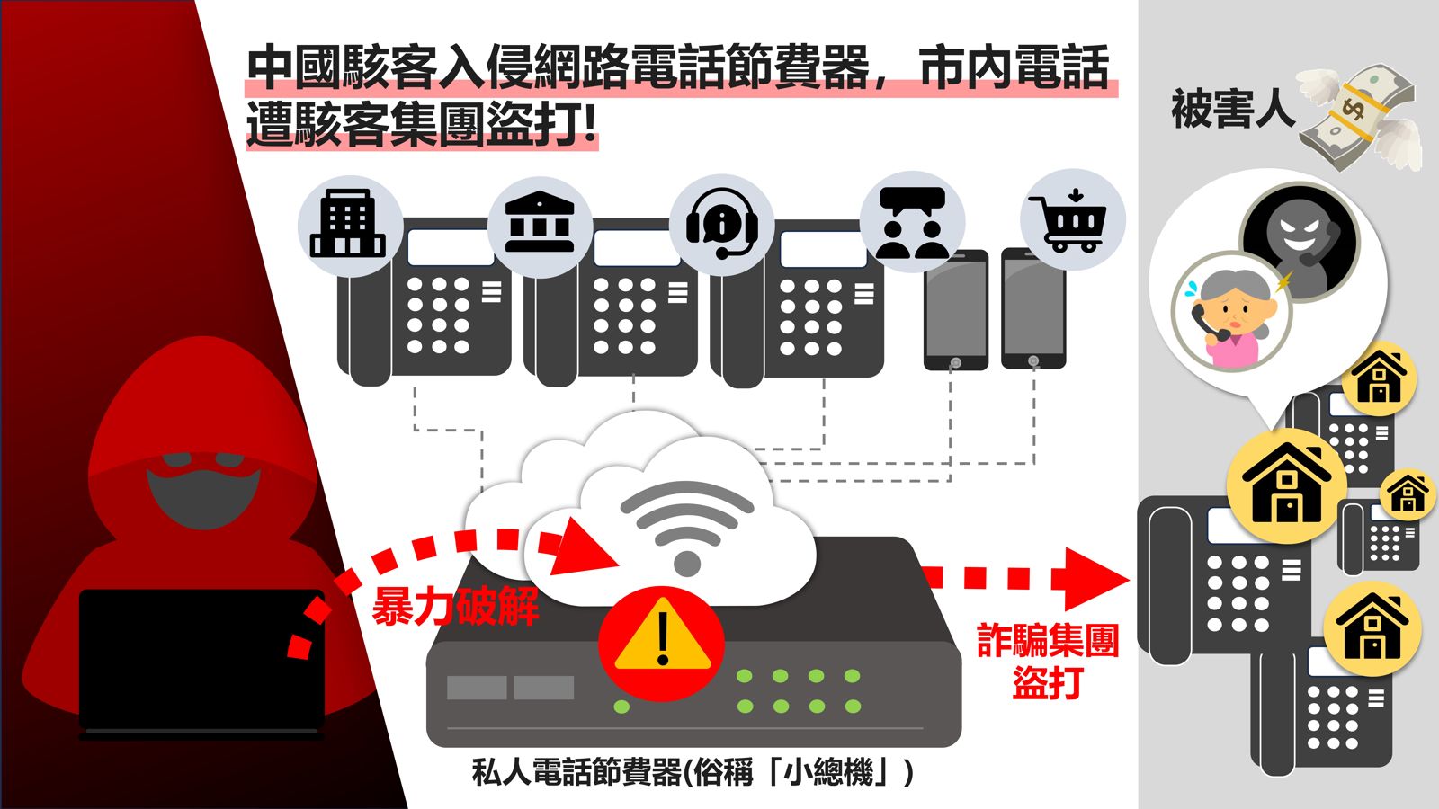 本案駭客俗稱電話飛客(Phreaker),通常指入侵電話系統,並企圖撥打免費長途電話之人,早期除盜打電話外,亦透過撥打高額付費電話後,與受話方拆帳而獲利。本案經刑事局溯源追查,相關駭侵攻擊來源係來自中國大陸,將持續追查偵辦。