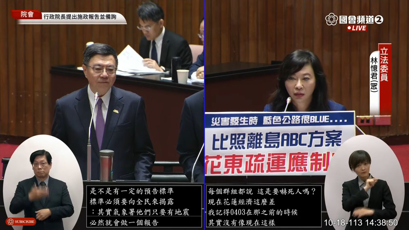 卓榮泰今前往立院做施政報告並備質詢,輪到林憶君時,她時先是肯定卓榮泰上任後每個月都有到花蓮視察,但話鋒一轉質疑卓榮泰是否有看到問題,表示花蓮最重要問題是「如何活下去」,天災導致各行各業變「慘業」。