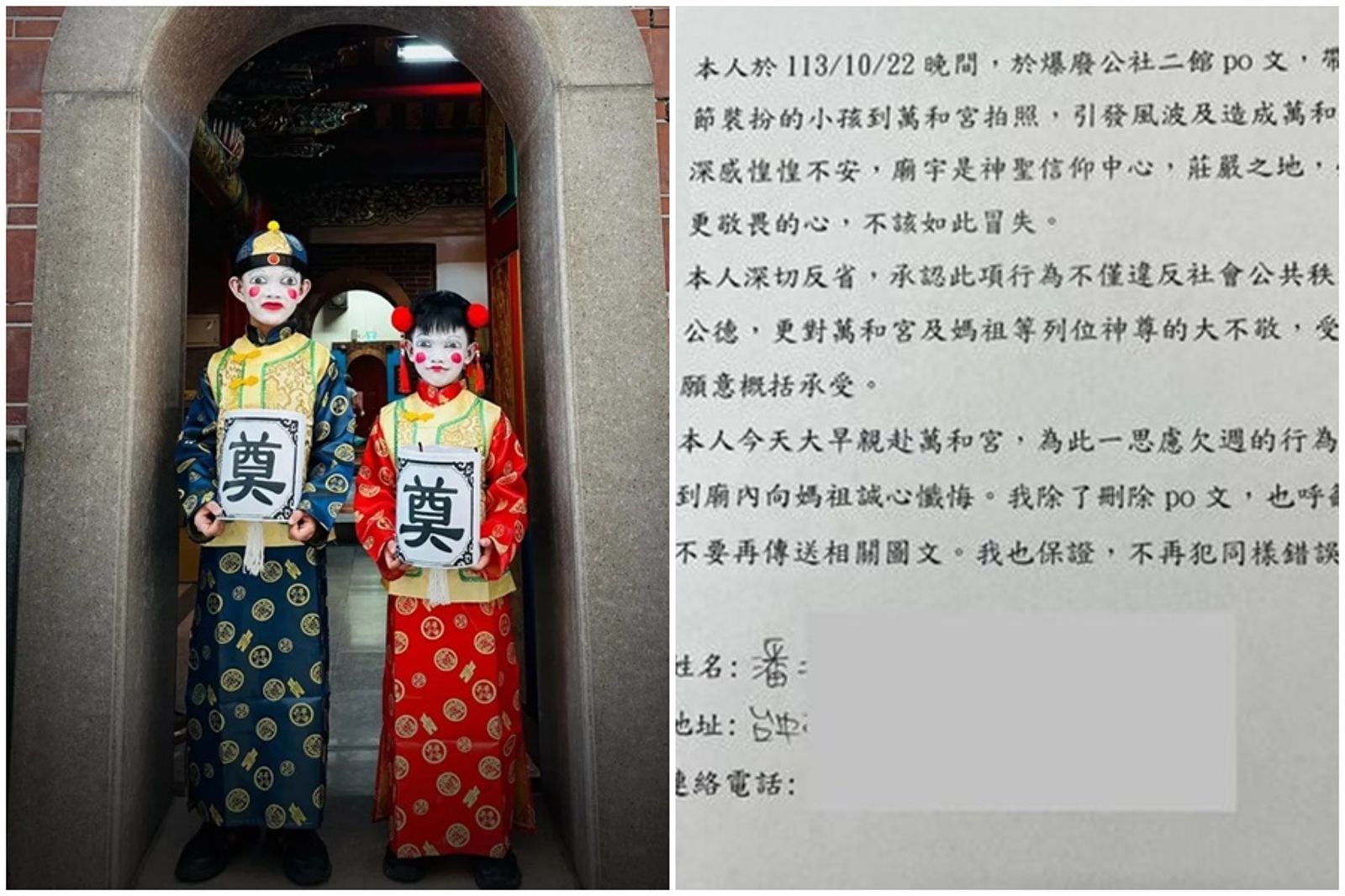 萬和宮稍早代潘女發出聲明稿,「本人於113/10/22 晚間,於爆廢公社二館po文,帶裝扮的小孩到萬和宮拍照,引發風波及造成萬和宮,深感惶惶不安,廟宇是神聖信仰中心,莊嚴之地,必須存著更敬畏的心,不該如此冒失。」同時表示已深切反省,對萬和宮及媽祖等列位神尊的大不敬,受到責難,願意概括承受,並保證不會有下次。