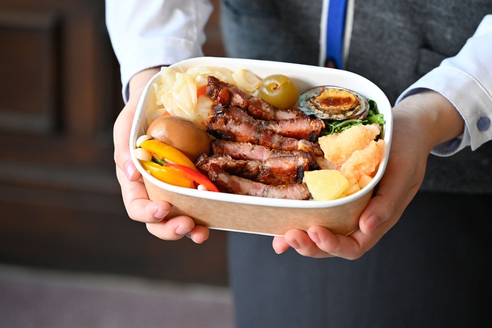 高雄餐旅分處因應台灣設計展而隆重推出「澎派便當」,主菜部分選用台灣在地豬肉,經獨門祕方醃製後,放入烤箱烘烤,外皮酥脆,鹹香入味,配上Q彈香甜小米飯,好吃到停不下來。