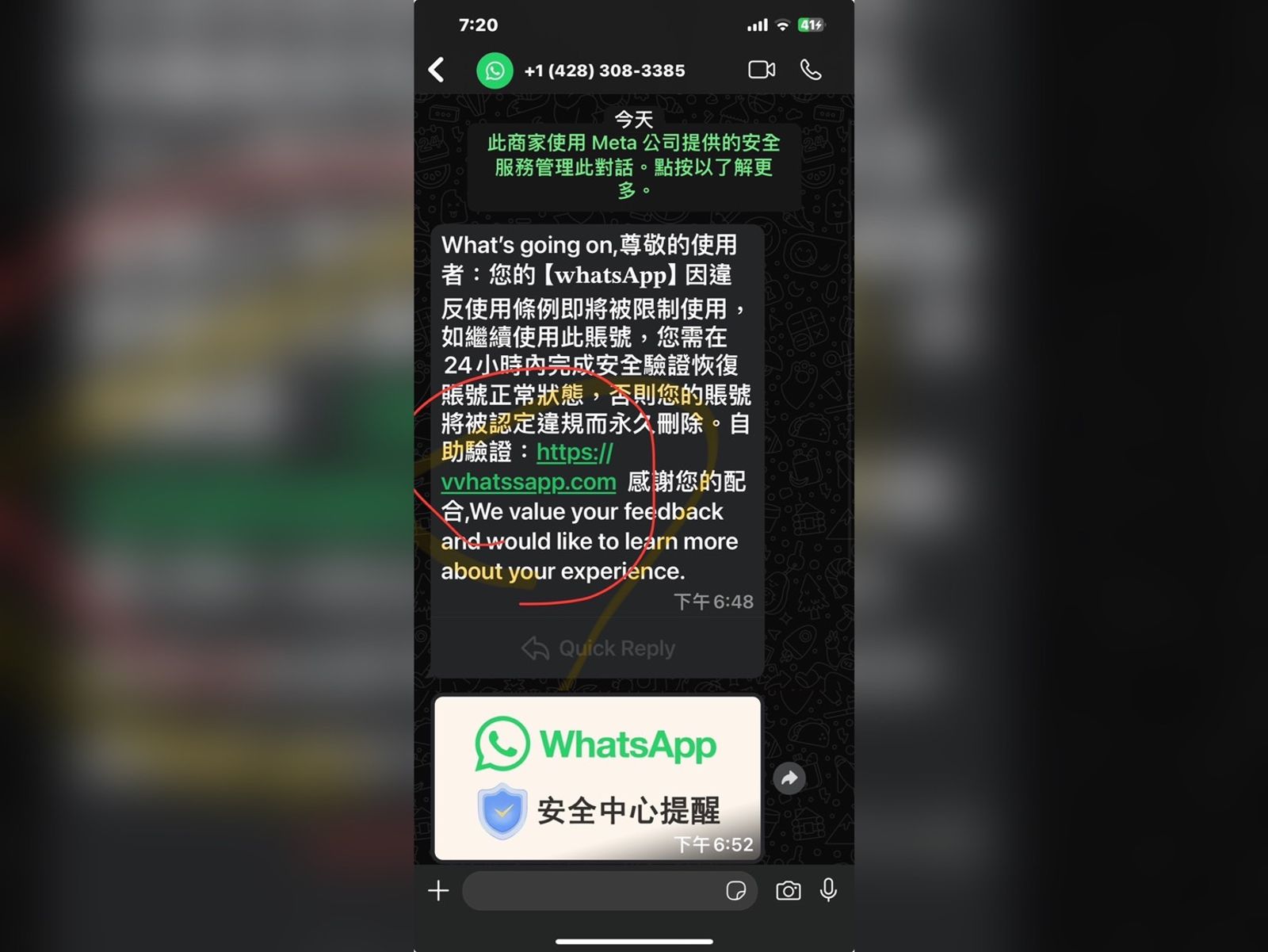 中部地區王姓女子於不明的購物網站留下自己的通訊軟體「whatsApp」帳號及號碼,卻在不久後收到一不明簡訊表示,「whatsApp」帳號異常,需要重新驗證,否則將永久刪除帳號。